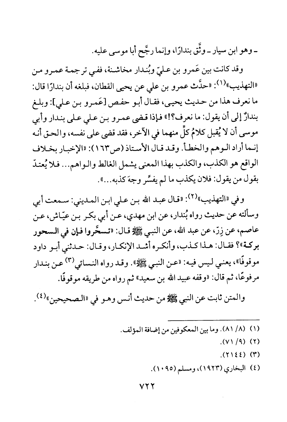 وقد كانت بين عَمرو بن عليّ وبُندار مخاشنة، ففي ترجمة عمرو من «التهذيب» (¬١): «حدَّث عمرو بن علي عن يحيى القطان، فبلغه أن بندارًا قال: ما نعرف هذا من حديث يحيى، فقال أبو حفص [عَمرو بن علي]: وبلغ بندارٌ إلى أن يقول: ما نعرف؟ ! » فإذا قضى عمرو بن علي على بندار وأبي موسى أن لا يُقبل كلامُ كلِّ منهما في الآخر، فقد قضى على نفسه، والحق أنه إنما أراد الوهم والخطأ. وقد قال الأستاذ (ص ١٦٣): «الإخبار بخلاف الواقع هو الكذب، والكذب بهذا المعنى يشمل الغالط والواهم ... فلا يُعتدّ بقول من يقول: فلان يكذب ما لم يفسِّر وجهَ كذبه ... ».