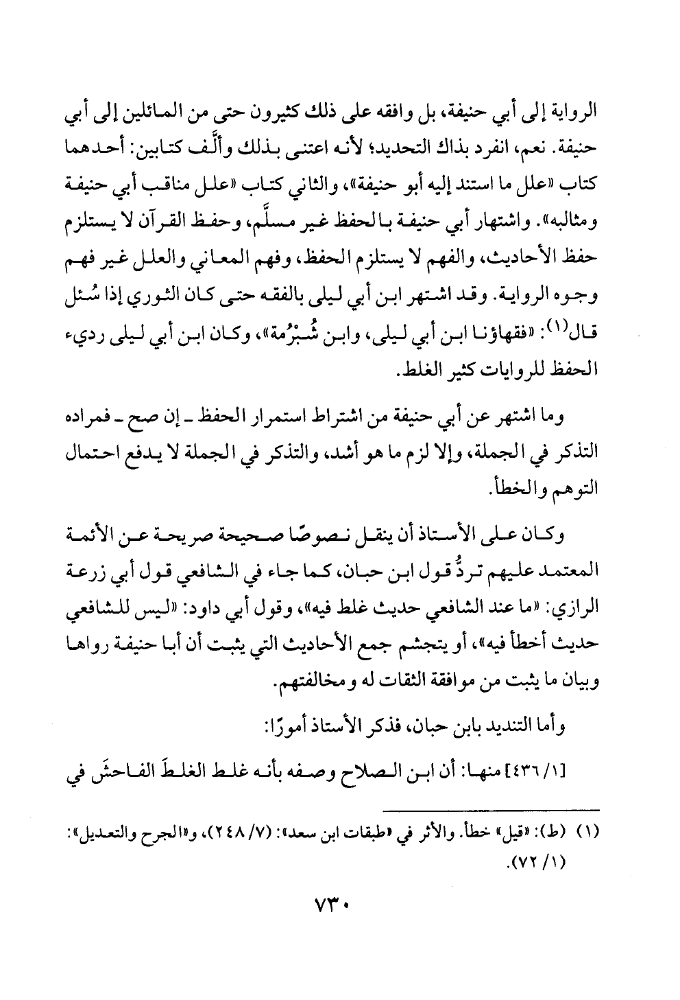 وكان على الأستاذ أن ينقل نصوصًا صحيحة صريحة عن الأئمة المعتمد عليهم تردُّ قول ابن حبان، كما جاء في الشافعي قول أبي زرعة الرازي: «ما عند الشافعي حديث غلط فيه»، وقول أبي داود: «ليس للشافعي حديث أخطأ فيه»، أو يتجشم جمع الأحاديث التي يثبت أن أبا حنيفة رواها وبيان ما يثبت من موافقة الثقات له ومخالفتهم.