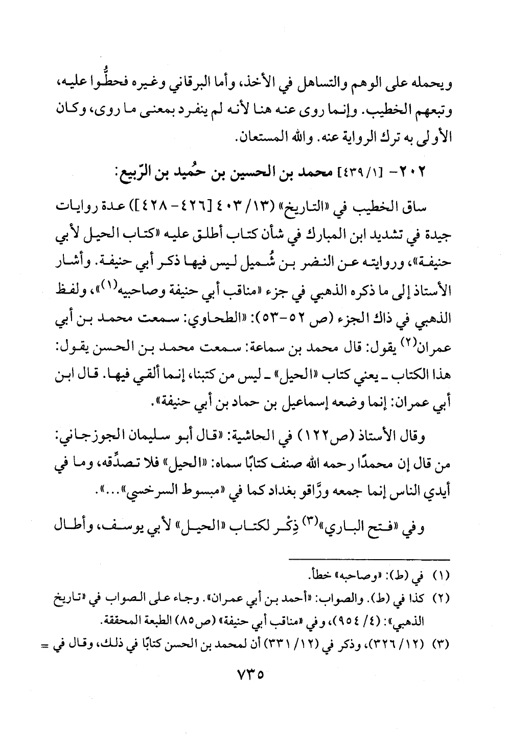 ساق الخطيب في «التاريخ» (١٣/ ٤٠٣ [٤٢٦ - ٤٢٨]) عدة روايات جيدة في تشديد ابن المبارك في شأن كتاب أطلق عليه «كتاب الحيل لأبي حنيفة»، وروايته عن النضر بن شُميل ليس فيها ذكر أبي حنيفة. وأشار الأستاذ إلى ما ذكره الذهبي في جزء «مناقب أبي حنيفة وصاحبيه (¬١)»، ولفظ الذهبي في ذاك الجزء (ص ٥٢ - ٥٣): «الطحاوي: سمعت محمد بن أبي عمران (¬٢) يقول: قال محمد بن سماعة: سمعت محمد بن الحسن يقول: هذا الكتاب ــ يعني كتاب «الحيل» ــ ليس من كتبنا، إنما ألقي فيها. قال ابن أبي عمران: إنما وضعه إسماعيل بن حماد بن أبي حنيفة».