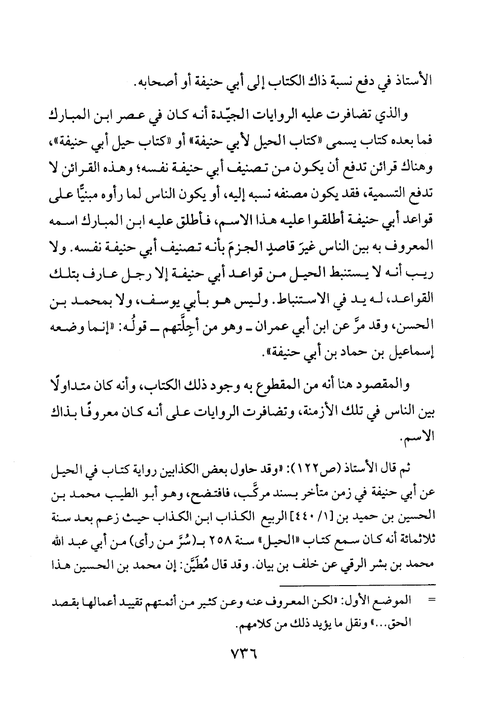 والذي تضافرت عليه الروايات الجيّدة أنه كان في عصر ابن المبارك فما بعده كتاب يسمى «كتاب الحيل لأبي حنيفة» أو «كتاب حيل أبي حنيفة»، وهناك قرائن تدفع أن يكون من تصنيف أبي حنيفة نفسه؛ وهذه القرائن لا تدفع التسمية، فقد يكون مصنفه نسبه إليه، أو يكون الناس لما رأوه مبنيًّا على قواعد أبي حنيفة أطلقوا عليه هذا الاسم، فأطلق عليه ابن المبارك اسمه المعروف به بين الناس غيرَ قاصدٍ الجزمَ بأنه تصنيف أبي حنيفة نفسه. ولا ريب أنه لا يستنبط الحيل من قواعد أبي حنيفة إلا رجل عارف بتلك القواعد، له يد في الاستنباط. وليس هو بأبي يوسف، ولا بمحمد بن الحسن، وقد مرَّ عن ابن أبي عمران ــ وهو من أجِلَّتهم ــ قولُه: «إنما وضعه إسماعيل بن حماد بن أبي حنيفة».
