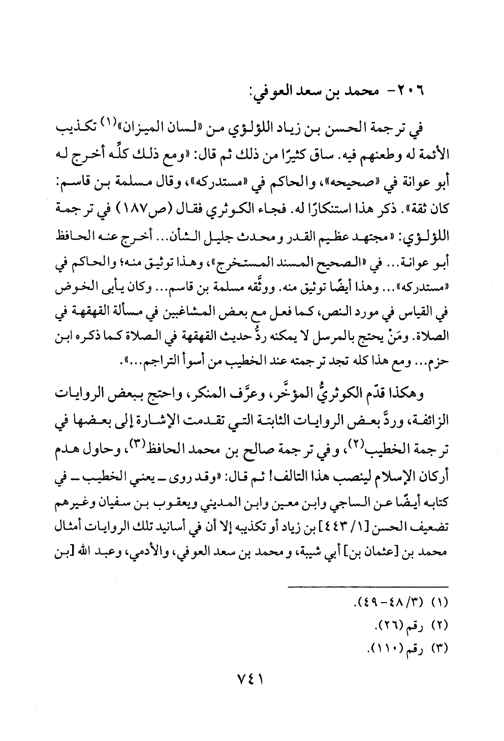 في ترجمة الحسن بن زياد اللؤلؤي من «لسان الميزان» (¬١) تكذيب الأئمة له وطعنهم فيه. ساق كثيرًا من ذلك ثم قال: «ومع ذلك كلِّه أخرج له أبو عوانة في «صحيحه»، والحاكم في «مستدركه»، وقال مسلمة بن قاسم: كان ثقة». ذكر هذا استنكارًا له. فجاء الكوثري فقال (ص ١٨٧) في ترجمة اللؤلؤي: «مجتهد عظيم القدر ومحدث جليل الشأن ... أخرج عنه الحافظ أبو عوانة ... في «الصحيح المسند المستخرج»، وهذا توثيق منه؛ والحاكم في «مستدركه» ... وهذا أيضًا توثيق منه. ووثَّقه مسلمة بن قاسم ... وكان يأبى الخوض في القياس في مورد النص، كما فعل مع بعض المشاغبين في مسألة القهقهة في الصلاة. ومَنْ يحتج بالمرسل لا يمكنه ردُّ حديث القهقهة في الصلاة كما ذكره ابن حزم ... ومع هذا كله تجد ترجمته عند الخطيب من أسوأ التراجم ... ».