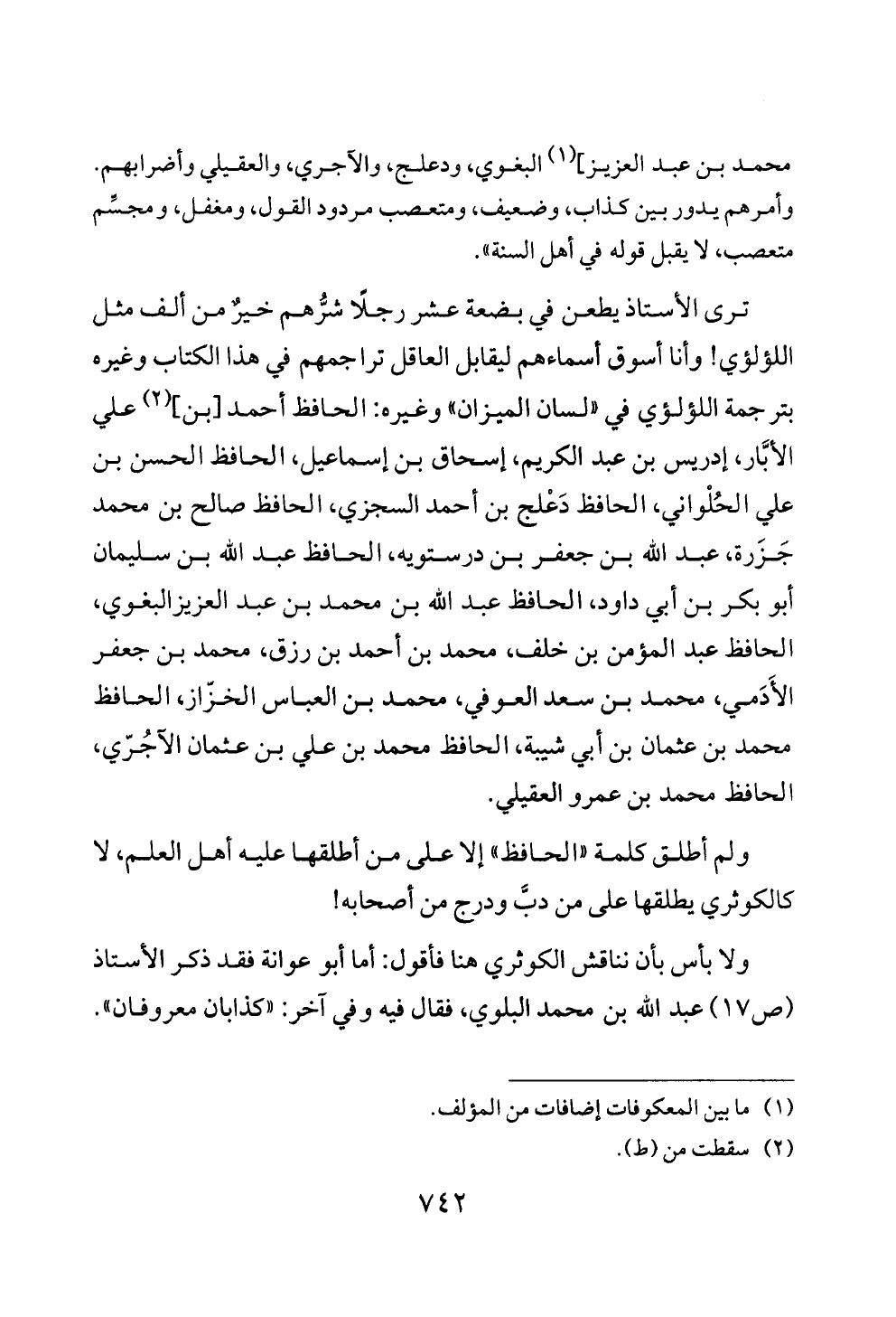 ولا بأس بأن نناقش الكوثري هنا فأقول: أما أبو عوانة فقد ذكر الأستاذ (ص ١٧) عبد الله بن محمد البلوي، فقال فيه وفي آخر: «كذابان معروفان».