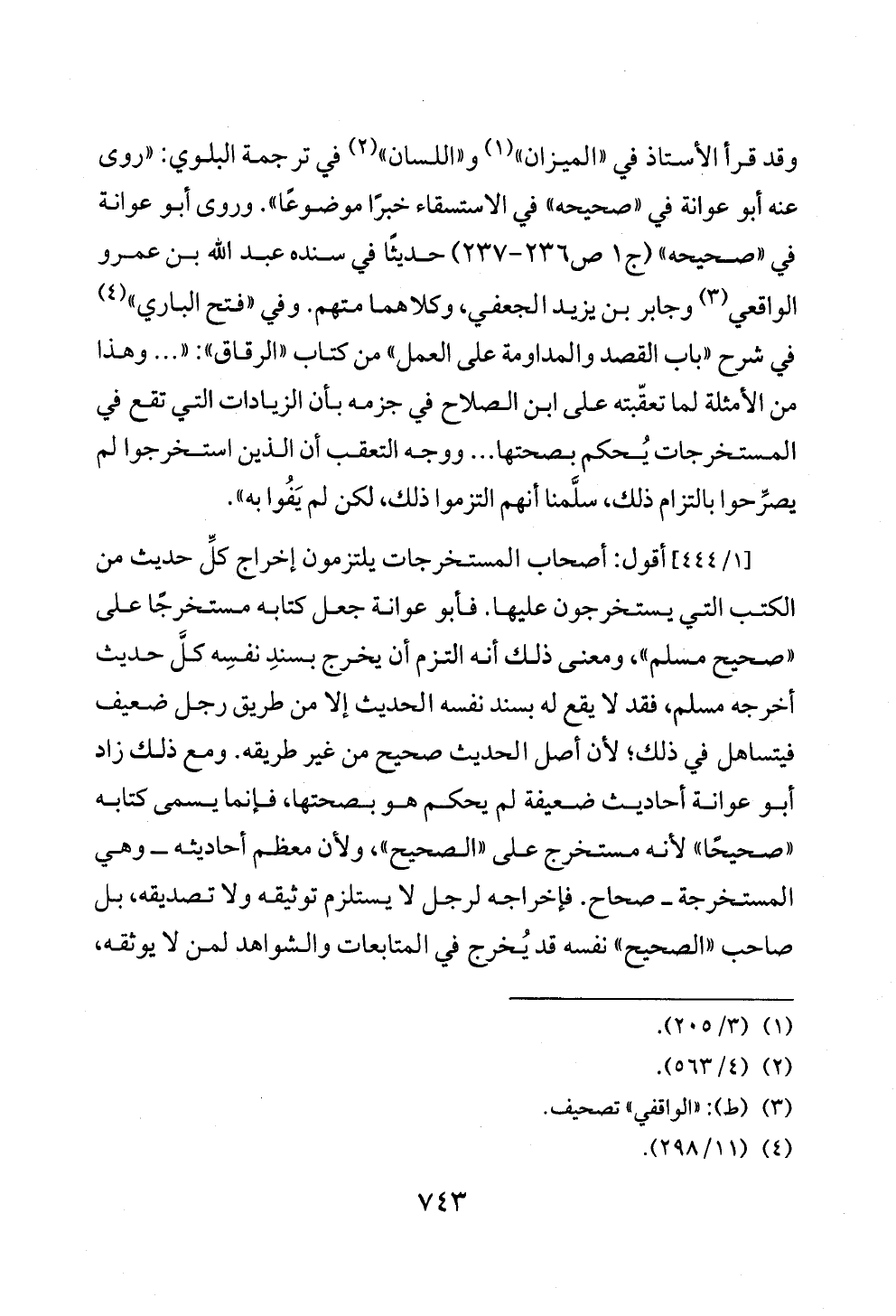 وقد قرأ الأستاذ في «الميزان» (¬١) و «اللسان» (¬٢) في ترجمة البلوي: «روى عنه أبو عوانة في «صحيحه» في الاستسقاء خبرًا موضوعًا». وروى أبو عوانة في «صحيحه» (ج ١ ص ٢٣٦ - ٢٣٧) حديثًا في سنده عبد الله بن عمرو الواقعي (¬٣) وجابر بن يزيد الجعفي، وكلاهما متهم. وفي «فتح الباري» (¬٤) في شرح «باب القصد والمداومة على العمل» من كتاب «الرقاق»: « ... وهذا من الأمثلة لما تعقّبته على ابن الصلاح في جزمه بأن الزيادات التي تقع في المستخرجات يُحكم بصحتها ... ووجه التعقب أن الذين استخرجوا لم يصرِّحوا بالتزام ذلك، سلَّمنا أنهم التزموا ذلك، لكن لم يَفُوا به».