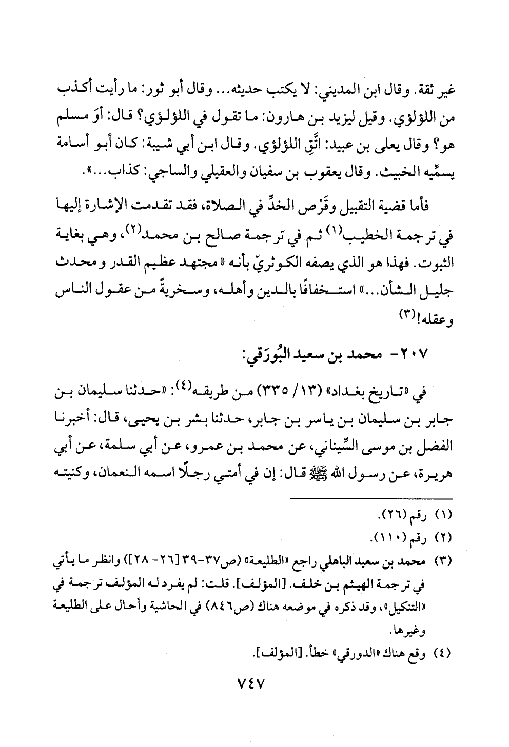 (¬٣) محمد بن سعيد الباهلي راجع «الطليعة» (ص ٣٧ - ٣٩ [٢٦ - ٢٨]) وانظر ما يأتي في ترجمة الهيثم بن خلف. [المؤلف]. قلت: لم يفرد له المؤلف ترجمة في «التنكيل»، وقد ذكره في موضعه هناك (ص ٨٤٦) في الحاشية وأحال على الطليعة وغيرها.