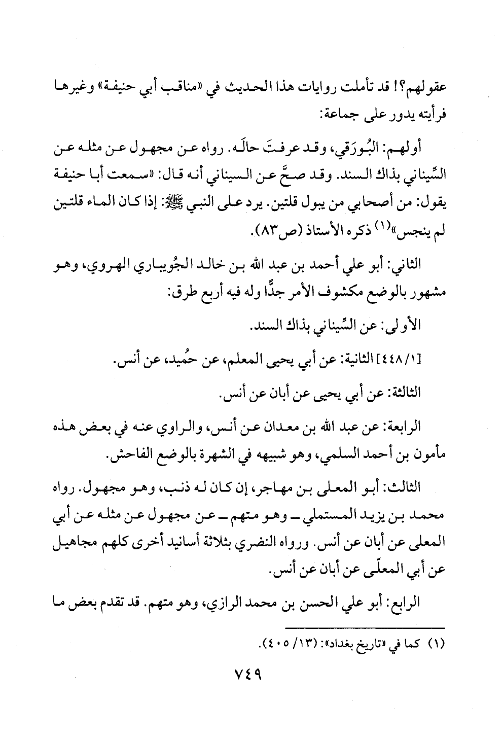 أولهم: البُورَقي، وقد عرفتَ حالَه. رواه عن مجهول عن مثله عن السِّيناني بذاك السند. وقد صحَّ عن السيناني أنه قال: «سمعت أبا حنيفة يقول: من أصحابي من يبول قلتين. يرد على النبي - صلى الله عليه وسلم -: إذا كان الماء قلتين لم ينجس» (¬١) ذكره الأستاذ (ص ٨٣).