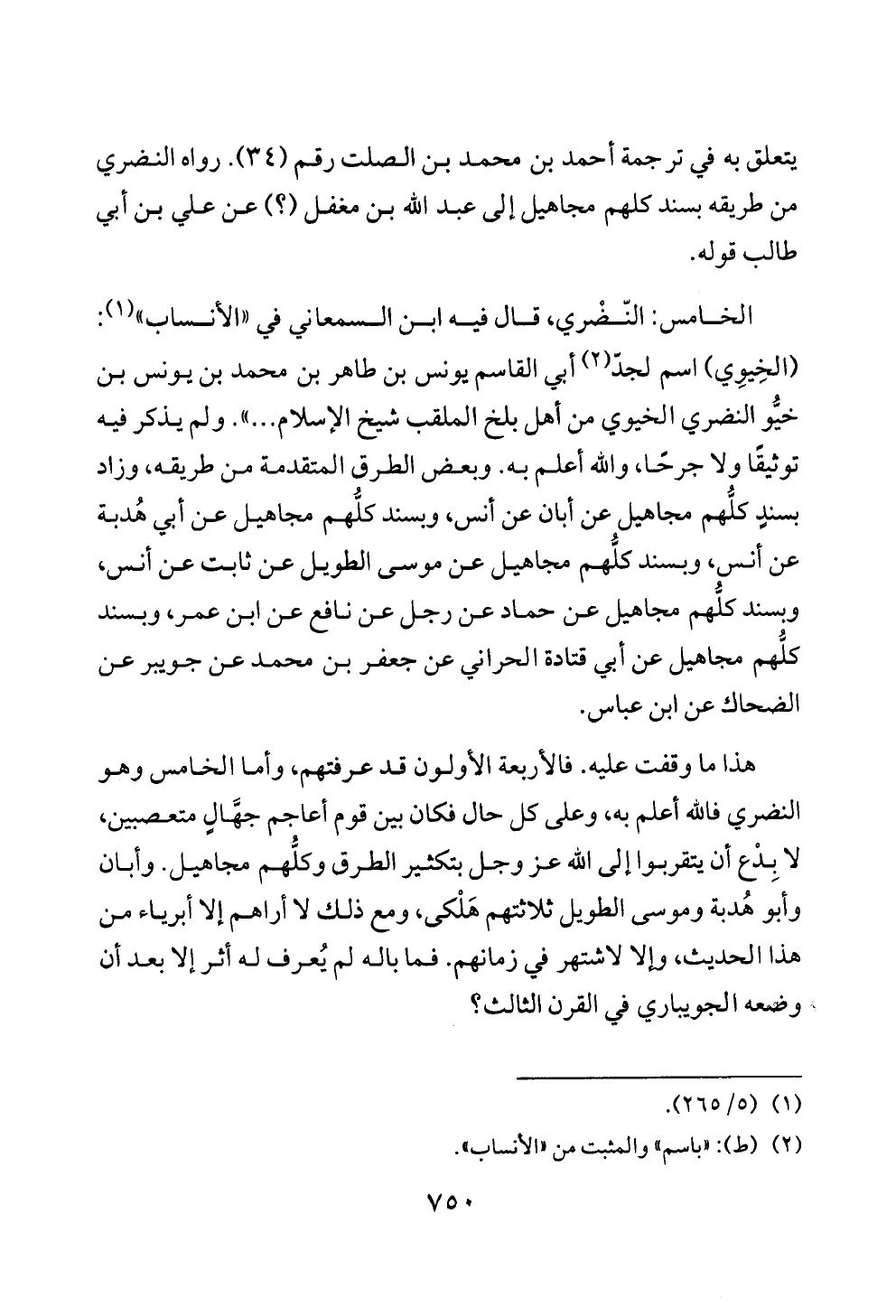 الخامس: النّضْري، قال فيه ابن السمعاني في «الأنساب» (¬١): (الخِيوِي) اسم لجدّ (¬٢) أبي القاسم يونس بن طاهر بن محمد بن يونس بن خيُّو النضري الخيوي من أهل بلخ الملقب شيخ الإسلام ... ». ولم يذكر فيه توثيقًا ولا جرحًا، والله أعلم به. وبعض الطرق المتقدمة من طريقه، وزاد بسندٍ كلُّهم مجاهيل عن أبان عن أنس، وبسند كلُّهم مجاهيل عن أبي هُدبة عن أنس، وبسند كلُّهم مجاهيل عن موسى الطويل عن ثابت عن أنس، وبسند كلُّهم مجاهيل عن حماد عن رجل عن نافع عن ابن عمر، وبسند كلُّهم مجاهيل عن أبي قتادة الحراني عن جعفر بن محمد عن جويبر عن الضحاك عن ابن عباس.