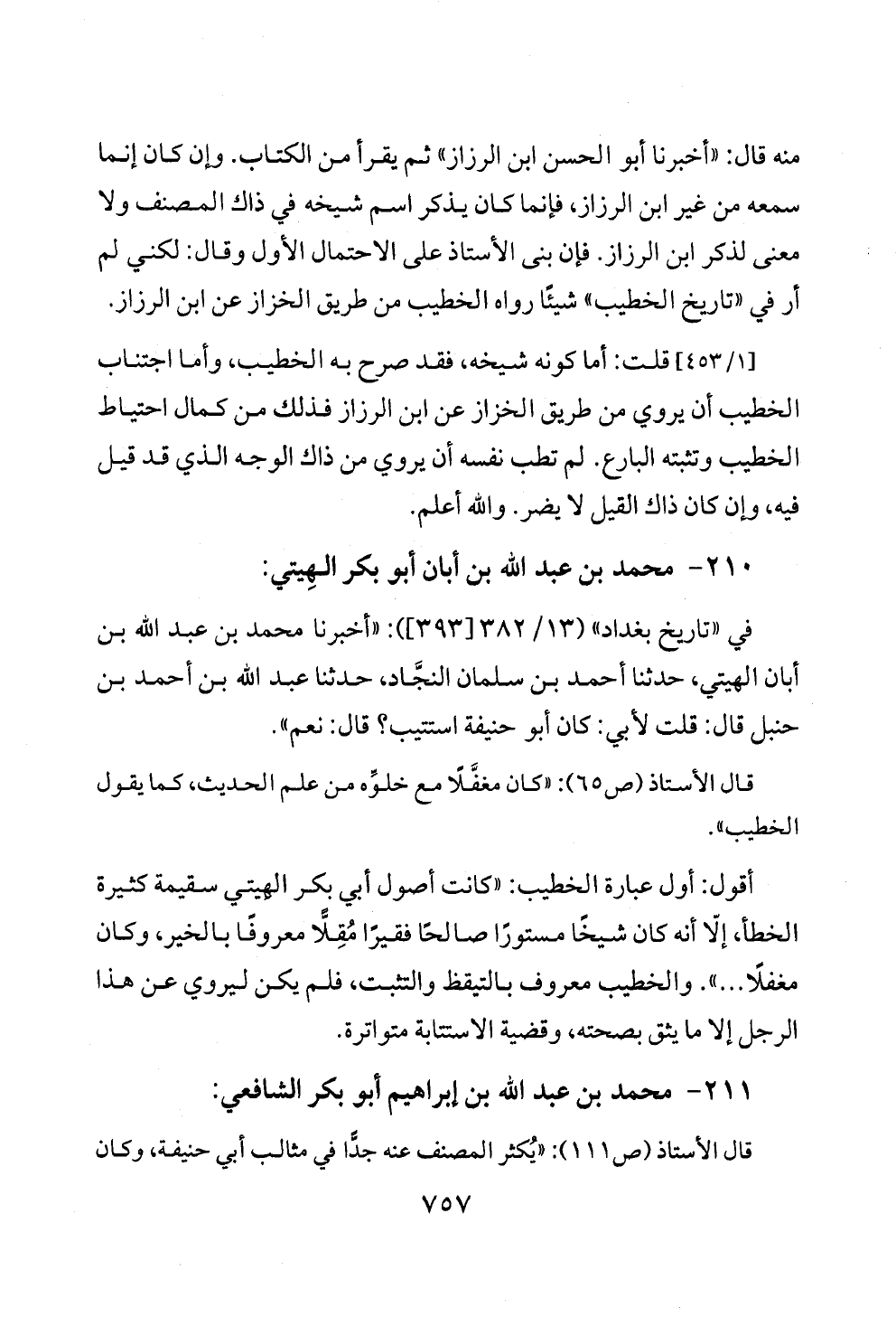 [١/ ٤٥٣] قلت: أما كونه شيخه، فقد صرح به الخطيب، وأما اجتناب الخطيب أن يروي من طريق الخزاز عن ابن الرزاز فذلك من كمال احتياط الخطيب وتثبته البارع. لم تطب نفسه أن يروي من ذاك الوجه الذي قد قيل فيه، وإن كان ذاك القيل لا يضر. والله أعلم.