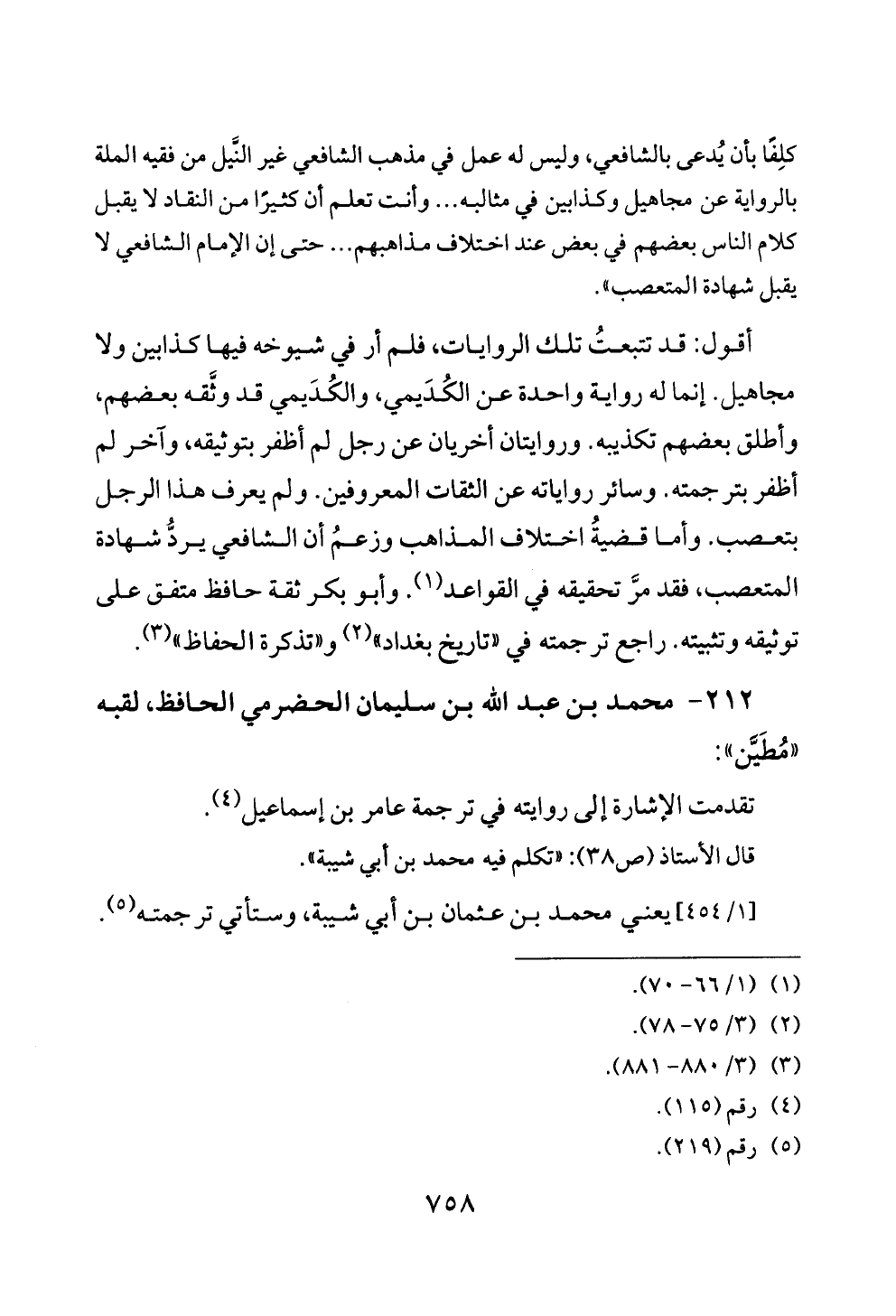 أقول: قد تتبعتُ تلك الروايات، فلم أر في شيوخه فيها كذابين ولا مجاهيل. إنما له رواية واحدة عن الكُدَيمي، والكُدَيمي قد وثَّقه بعضهم، وأطلق بعضهم تكذيبه. وروايتان أخريان عن رجل لم أظفر بتوثيقه، وآخر لم أظفر بترجمته. وسائر رواياته عن الثقات المعروفين. ولم يعرف هذا الرجل بتعصب. وأما قضيةُ اختلاف المذاهب وزعمُ أن الشافعي يردُّ شهادة المتعصب، فقد مرَّ تحقيقه في القواعد (¬١). وأبو بكر ثقة حافظ متفق على توثيقه وتثبيته. راجع ترجمته في «تاريخ بغداد» (¬٢) و «تذكرة الحفاظ» (¬٣).