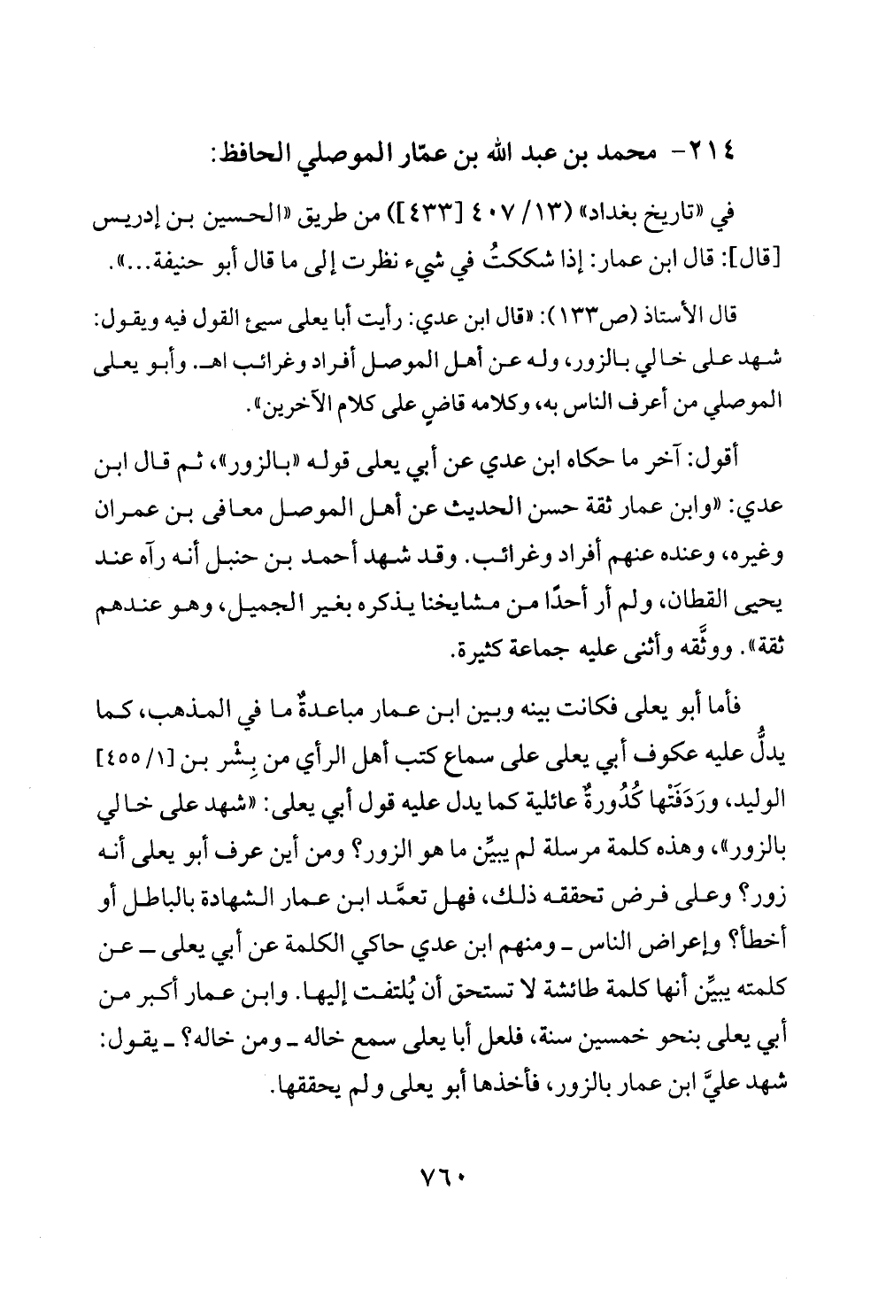 أقول: آخر ما حكاه ابن عدي عن أبي يعلى قوله «بالزور»، ثم قال ابن عدي: «وابن عمار ثقة حسن الحديث عن أهل الموصل معافى بن عمران وغيره، وعنده عنهم أفراد وغرائب. وقد شهد أحمد بن حنبل أنه رآه عند يحيى القطان، ولم أر أحدًا من مشايخنا يذكره بغير الجميل، وهو عندهم ثقة». ووثَّقه وأثنى عليه جماعة كثيرة.