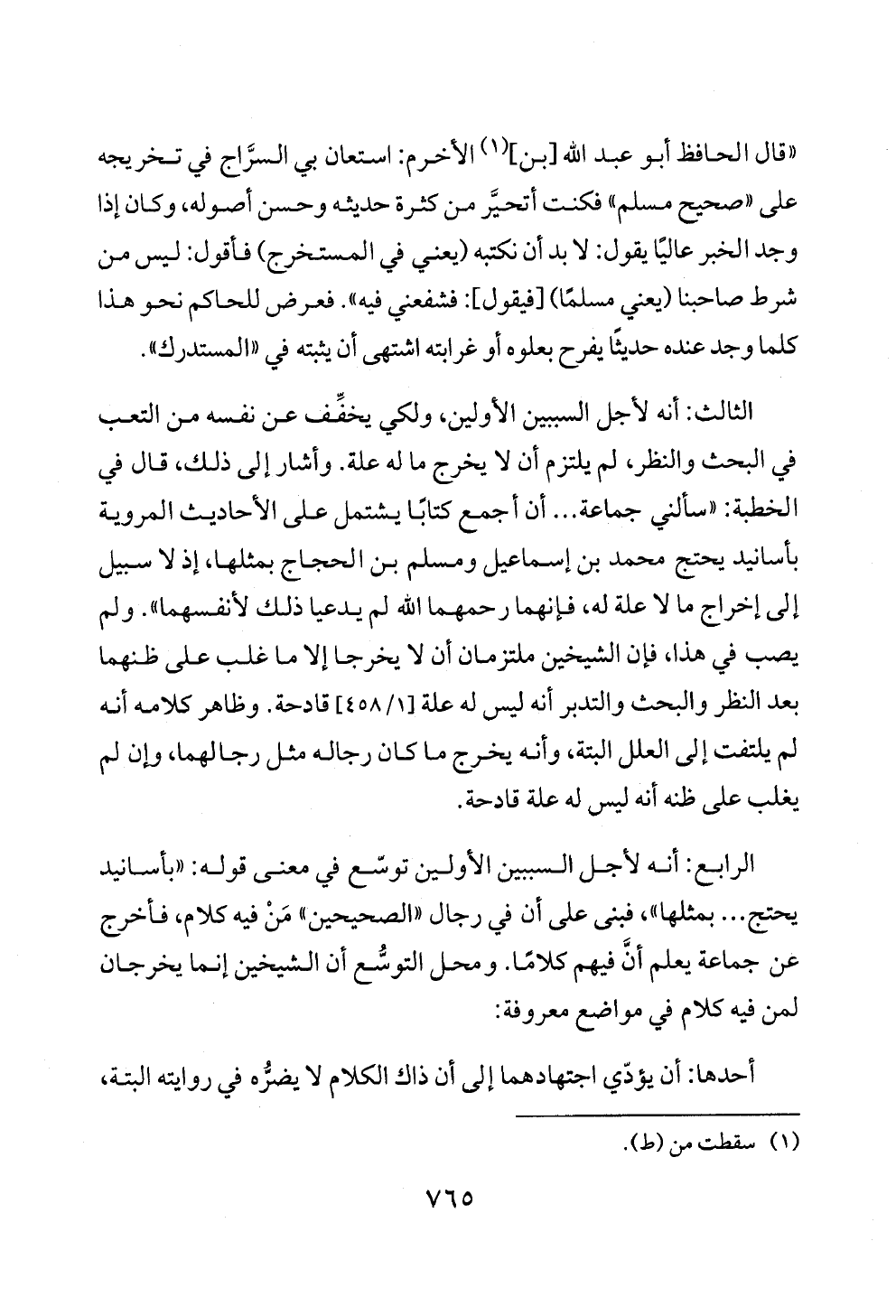 الثالث: أنه لأجل السببين الأولين، ولكي يخفِّف عن نفسه من التعب في البحث والنظر، لم يلتزم أن لا يخرج ما له علة. وأشار إلى ذلك، قال في الخطبة: «سألني جماعة ... أن أجمع كتابًا يشتمل على الأحاديث المروية بأسانيد يحتج محمد بن إسماعيل ومسلم بن الحجاج بمثلها، إذ لا سبيل إلى إخراج ما لا علة له، فإنهما رحمهما الله لم يدعيا ذلك لأنفسهما». ولم يصب في هذا، فإن الشيخين ملتزمان أن لا يخرجا إلا ما غلب على ظنهما بعد النظر والبحث والتدبر أنه ليس له علة [١/ ٤٥٨] قادحة. وظاهر كلامه أنه لم يلتفت إلى العلل البتة، وأنه يخرج ما كان رجاله مثل رجالهما، وإن لم يغلب على ظنه أنه ليس له علة قادحة.