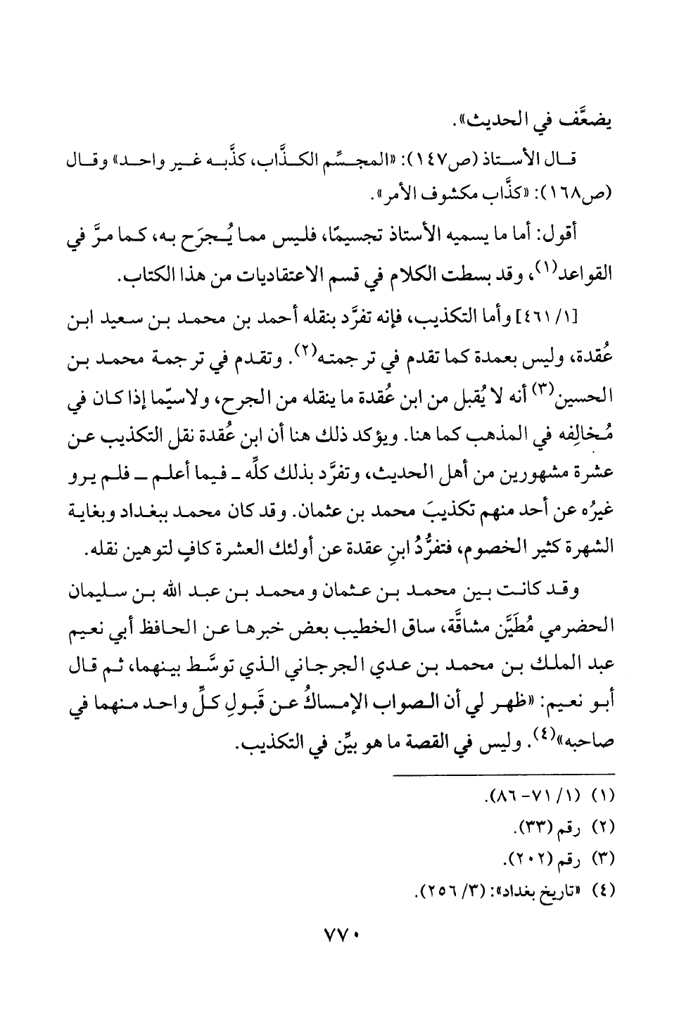 [١/ ٤٦١] وأما التكذيب، فإنه تفرَّد بنقله أحمد بن محمد بن سعيد ابن عُقدة، وليس بعمدة كما تقدم في ترجمته (¬٢). وتقدم في ترجمة محمد بن الحسين (¬٣) أنه لا يُقبل من ابن عُقدة ما ينقله من الجرح، ولاسيّما إذا كان في مُخالِفه في المذهب كما هنا. ويؤكد ذلك هنا أن ابن عُقدة نقل التكذيب عن عشرة مشهورين من أهل الحديث، وتفرَّد بذلك كلِّه ــ فيما أعلم ــ فلم يرو غيرُه عن أحد منهم تكذيبَ محمد بن عثمان. وقد كان محمد ببغداد وبغاية الشهرة كثير الخصوم، فتفرُّدُ ابنِ عقدة عن أولئك العشرة كافٍ لتوهين نقله.