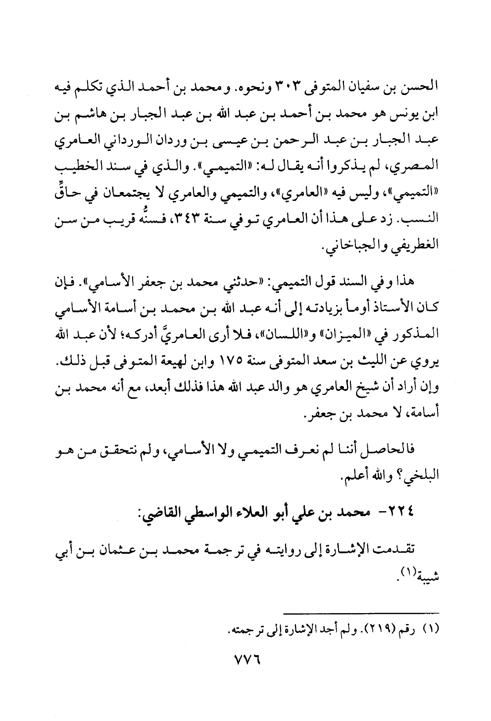 هذا وفي السند قول التميمي: «حدثني محمد بن جعفر الأسامي». فإن كان الأستاذ أومأ بزيادته إلى أنه عبد الله بن محمد بن أسامة الأسامي المذكور في «الميزان» و «اللسان»، فلا أرى العامريَّ أدركه؛ لأن عبد الله يروي عن الليث بن سعد المتوفى سنة ١٧٥ وابن لهيعة المتوفى قبل ذلك. وإن أراد أن شيخ العامري هو والد عبد الله هذا فذلك أبعد، مع أنه محمد بن أسامة، لا محمد بن جعفر.
