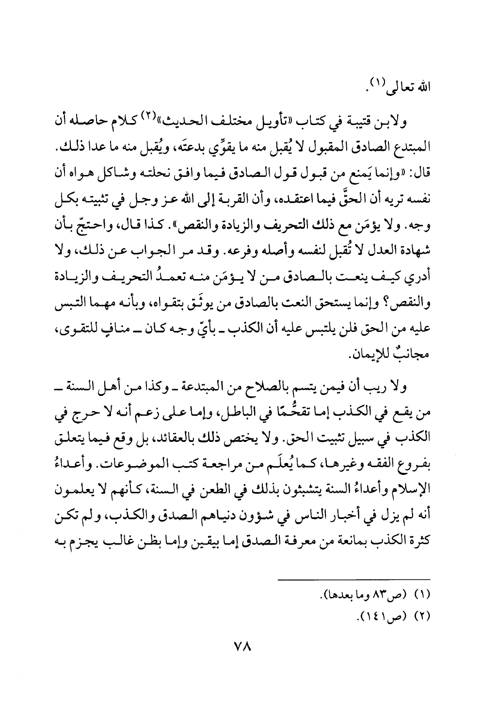 ولابن قتيبة في كتاب "تأويل مختلف الحديث" (¬٢) كلام حاصله أن المبتدع الصادق المقبول لا يُقبل منه ما يقوِّي بدعتَه، ويُقبل منه ما عدا ذلك. قال: "وإنما يَمنع من قبول قول الصادق فيما وافق نحلته وشاكل هواه أن نفسه تريه أن الحقَّ فيما اعتقده، وأن القربة إلى الله عز وجل في تثبيته بكل وجه. ولا يؤمَن مع ذلك التحريف والزيادة والنقص". كذا قال، واحتجّ بأن شهادة العدل لا تُقبل لنفسه وأصله وفرعه. وقد مر الجواب عن ذلك، ولا أدري كيف ينعت بالصادق من لا يؤمَن منه تعمدُ التحريف والزيادة والنقص؟ وإنما يستحق النعت بالصادق من يوثَق بتقواه، وبأنه مهما التبس عليه من الحق فلن يلتبس عليه أن الكذب ــ بأيّ وجه كان ــ منافٍ للتقوى، مجانبٌ للإيمان.
