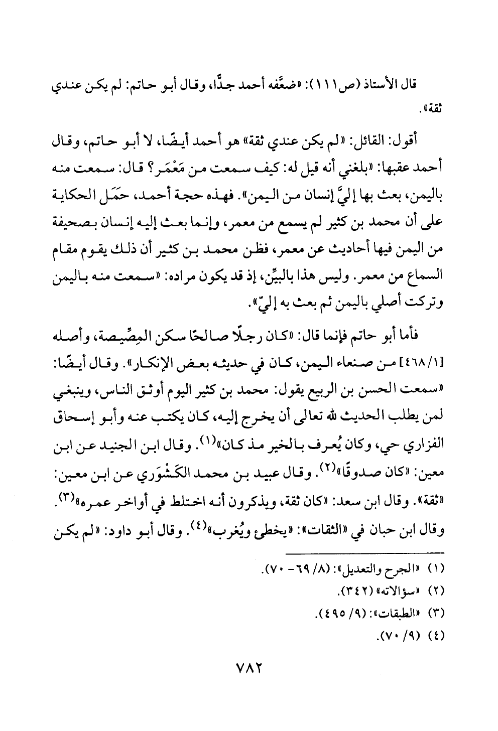 أقول: القائل: «لم يكن عندي ثقة» هو أحمد أيضًا، لا أبو حاتم، وقال أحمد عقبها: «بلغني أنه قيل له: كيف سمعت من مَعْمَر؟ قال: سمعت منه باليمن، بعث بها إليَّ إنسان من اليمن». فهذه حجة أحمد، حَمَل الحكاية على أن محمد بن كثير لم يسمع من معمر، وإنما بعث إليه إنسان بصحيفة من اليمن فيها أحاديث عن معمر، فظن محمد بن كثير أن ذلك يقوم مقام السماع من معمر. وليس هذا بالبيِّن، إذ قد يكون مراده: «سمعت منه باليمن وتركت أصلي باليمن ثم بعث به إليّ».