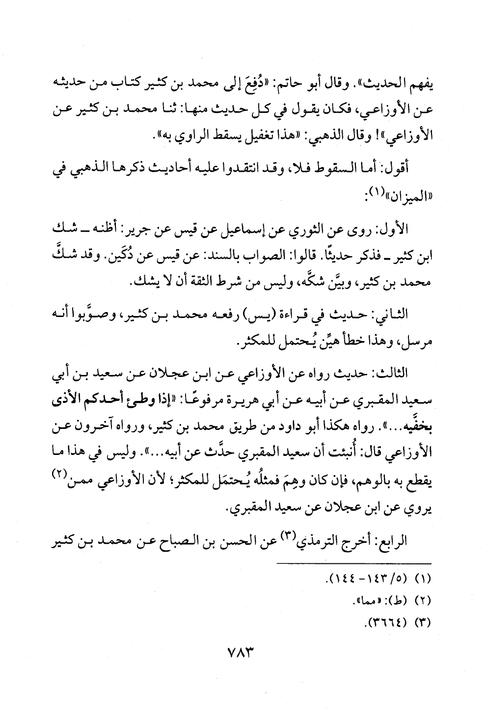 يفهم الحديث». وقال أبو حاتم: «دُفِعَ إلى محمد بن كثير كتاب من حديثه عن الأوزاعي، فكان يقول في كل حديث منها: ثنا محمد بن كثير عن الأوزاعي»! وقال الذهبي: «هذا تغفيل يسقط الراوي به».