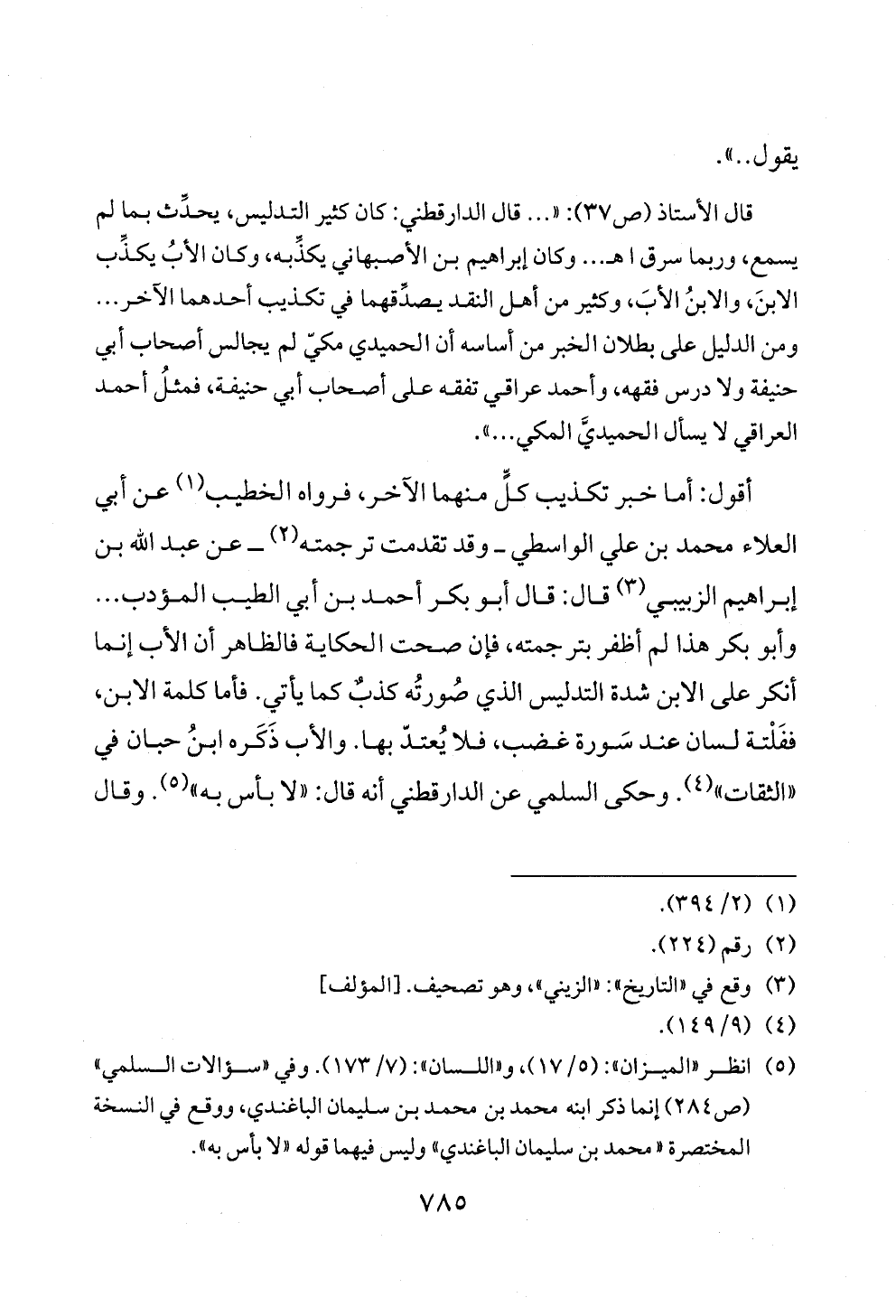 أقول: أما خبر تكذيب كلٍّ منهما الآخر، فرواه الخطيب (¬١) عن أبي العلاء محمد بن علي الواسطي ــ وقد تقدمت ترجمته (¬٢) ــ عن عبد الله بن إبراهيم الزبيبي (¬٣) قال: قال أبو بكر أحمد بن أبي الطيب المؤدب ... وأبو بكر هذا لم أظفر بترجمته، فإن صحت الحكاية فالظاهر أن الأب إنما أنكر على الابن شدة التدليس الذي صُورتُه كذبٌ كما يأتي. فأما كلمة الابن، ففَلْتة لسان عند سَورة غضب، فلا يُعتدّ بها. والأب ذَكَره ابنُ حبان في «الثقات» (¬٤). وحكى السلمي عن الدارقطني أنه قال: «لا بأس به» (¬٥). وقال