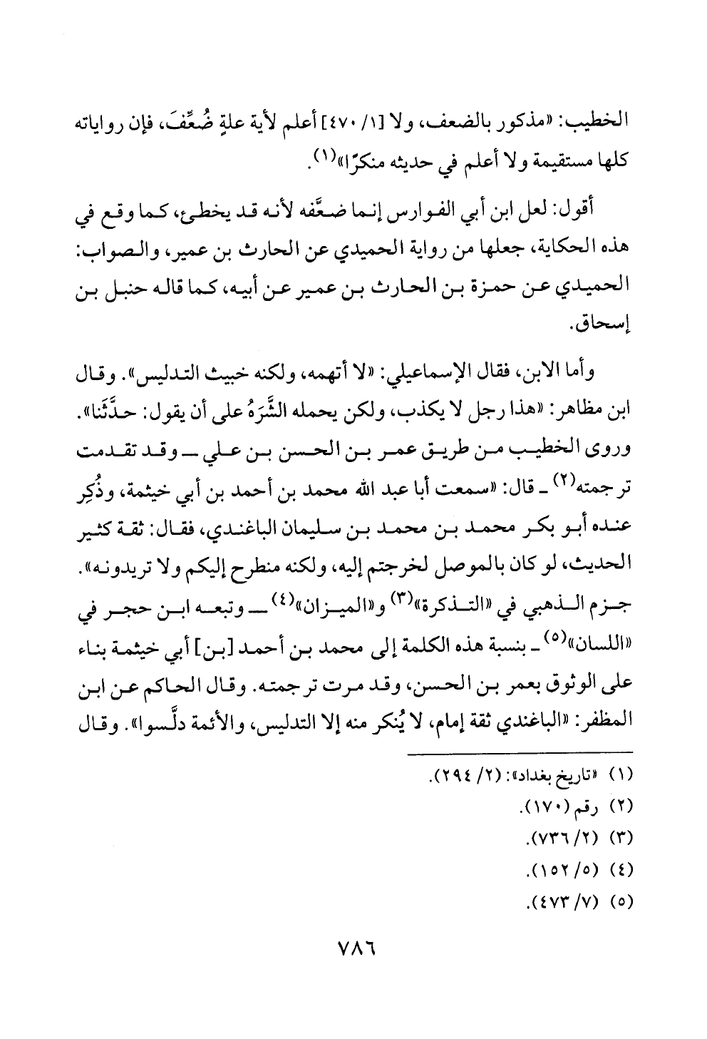 وأما الابن، فقال الإسماعيلي: «لا أتهمه، ولكنه خبيث التدليس». وقال ابن مظاهر: «هذا رجل لا يكذب، ولكن يحمله الشَّرَهُ على أن يقول: حدَّثَنا». وروى الخطيب من طريق عمر بن الحسن بن علي ــ وقد تقدمت ترجمته (¬٢) ــ قال: «سمعت أبا عبد الله محمد بن أحمد بن أبي خيثمة، وذُكِر عنده أبو بكر محمد بن محمد بن سليمان الباغندي، فقال: ثقة كثير الحديث، لو كان بالموصل لخرجتم إليه، ولكنه منطرح إليكم ولا تريدونه». جزم الذهبي في «التذكرة» (¬٣) و «الميزان» (¬٤) ــ وتبعه ابن حجر في «اللسان» (¬٥) ــ بنسبة هذه الكلمة إلى محمد بن أحمد [بن] أبي خيثمة بناء على الوثوق بعمر بن الحسن، وقد مرت ترجمته. وقال الحاكم عن ابن المظفر: «الباغندي ثقة إمام، لا يُنكر منه إلا التدليس، والأئمة دلَّسوا». وقال