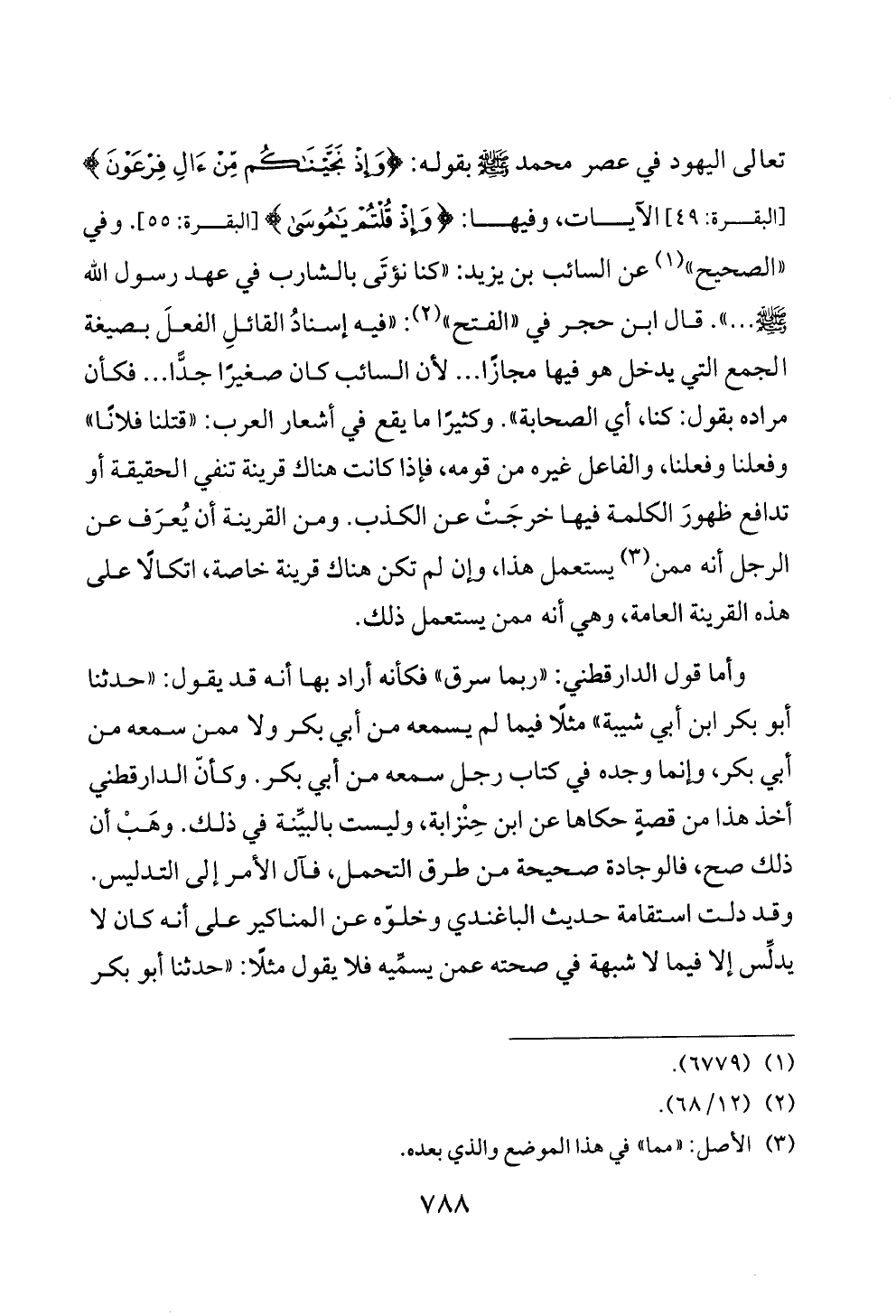 تعالى اليهود في عصر محمد - صلى الله عليه وسلم - بقوله: {وَإِذْ نَجَّيْنَاكُمْ مِنْ آلِ فِرْعَوْنَ} [البقرة: ٤٩] الآيات، وفيها: {وَإِذْ قُلْتُمْ يَامُوسَى} [البقرة: ٥٥]. وفي «الصحيح» (¬١) عن السائب بن يزيد: «كنا نؤتَى بالشارب في عهد رسول الله - صلى الله عليه وسلم - ... ». قال ابن حجر في «الفتح» (¬٢): «فيه إسنادُ القائلِ الفعلَ بصيغة الجمع التي يدخل هو فيها مجازًا ... لأن السائب كان صغيرًا جدًّا ... فكأن مراده بقول: كنا، أي الصحابة». وكثيرًا ما يقع في أشعار العرب: «قتلنا فلانًا» وفعلنا وفعلنا، والفاعل غيره من قومه، فإذا كانت هناك قرينة تنفي الحقيقة أو تدافع ظهورَ الكلمة فيها خرجَتْ عن الكذب. ومن القرينة أن يُعرَف عن الرجل أنه ممن (¬٣) يستعمل هذا، وإن لم تكن هناك قرينة خاصة، اتكالًا على هذه القرينة العامة، وهي أنه ممن يستعمل ذلك.