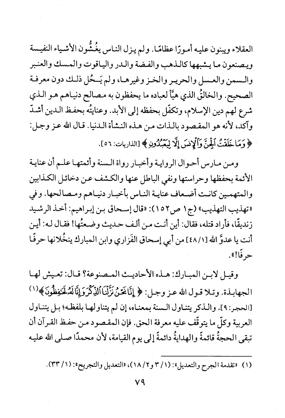 ومن مارس أحوال الرواية وأخبار رواة السنة وأئمتها علم أن عناية الأئمة بحفظها وحراستها ونفي الباطل عنها والكشف عن دخائل الكذابين والمتهمين كانت أضعاف عناية الناس بأخبار دنياهم ومصالحها. وفي "تهذيب التهذيب" (ج ١ ص ١٥٢): "قال إسحاق بن إبراهيم: أخذ الرشيد زنديقًا، فأراد قتله، فقال: أين أنت من ألف حديث وضعتُها! فقال له: أين أنت يا عدوَّ الله [١/ ٤٨] من أبي إسحاق الفَزاري وابن المبارك ينخُلانها حرفًا حرفًا! ".