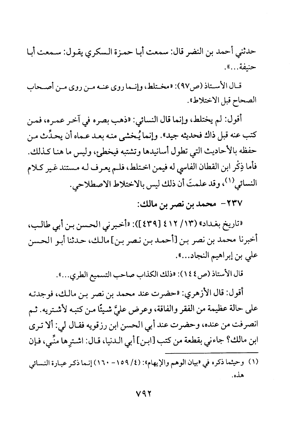 أقول: قال الأزهري: «حضرت عند محمد بن نصر بن مالك، فوجدته على حالة عظيمة من الفقر والفاقة، وعرض عليَّ شيئًا من كتبه لأشتريه. ثم انصرفت من عنده، وحضرت عند أبي الحسن ابن رزقويه فقال لي: ألا ترى ابن مالك؟ جاءني بقطعة من كتب [ابن] أبي الدنيا، قال: اشترِها منِّي، فإن