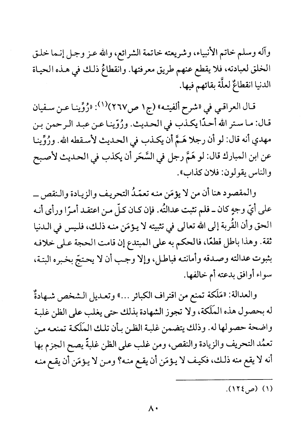 والمقصود هنا أن من لا يؤمَن منه تعمّدُ التحريف والزيادة والنقص ــ على أيّ وجهٍ كان ــ فلم تثبت عدالتُه. فإن كان كلّ من اعتقد أمرًا ورأى أنه الحق وأن القُربة إلى الله تعالى في تثبيته لا يؤمَن منه ذلك، فليس في الدنيا ثقة. وهذا باطل قطعًا، فالحكم به على المبتدع إن قامت الحجة على خلافه بثبوت عدالته وصدقه وأمانته فباطل، وإلا وجب أن لا يحتجّ بخبره البتة، سواء أوافق بدعته أم خالفها.