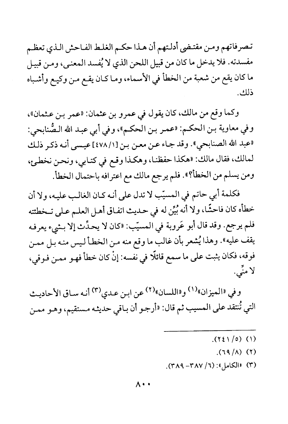 وكما وقع من مالك، كان يقول في عمرو بن عثمان: «عمر بن عثمان»، وفي معاوية بن الحكم: «عمر بن الحكم»، وفي أبي عبد الله الصُّنابحي: «عبد الله الصنابحي». وقد جاء عن معن بن [١/ ٤٧٨] عيسى أنه ذكر ذلك لمالك، فقال مالك: «هكذا حفظنا، وهكذا وقع في كتابي، ونحن نخطئ، ومن يسلم من الخطأ؟ ». فلم يرجع مالك مع اعترافه باحتمال الخطأ.