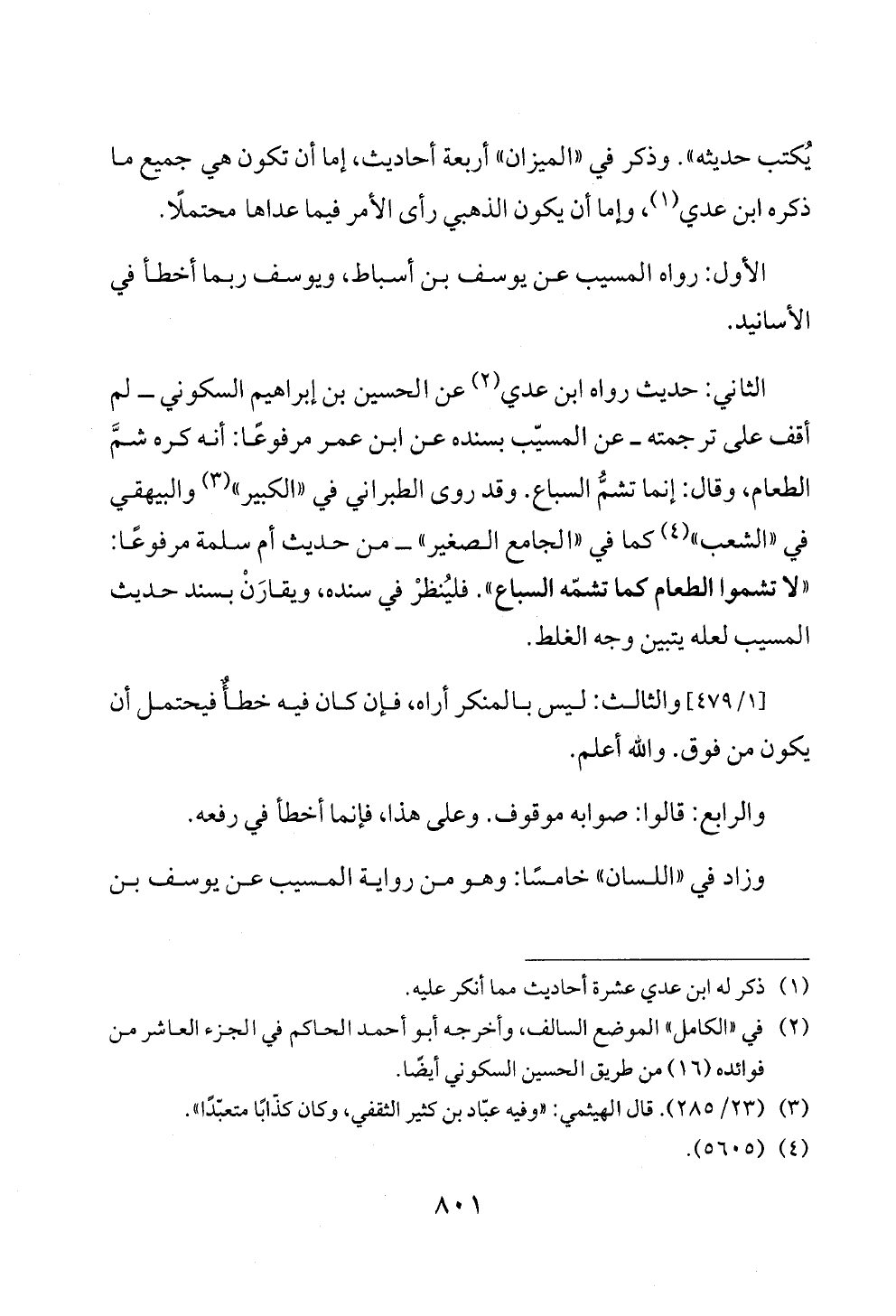 الثاني: حديث رواه ابن عدي (¬٢) عن الحسين بن إبراهيم السكوني ــ لم أقف على ترجمته ــ عن المسيّب بسنده عن ابن عمر مرفوعًا: أنه كره شمَّ الطعام، وقال: إنما تشمُّ السباع. وقد روى الطبراني في «الكبير» (¬٣) والبيهقي في «الشعب» (¬٤) كما في «الجامع الصغير» ــ من حديث أم سلمة مرفوعًا: «لا تشموا الطعام كما تشمّه السباع». فليُنظرْ في سنده، ويقارَنْ بسند حديث المسيب لعله يتبين وجه الغلط.