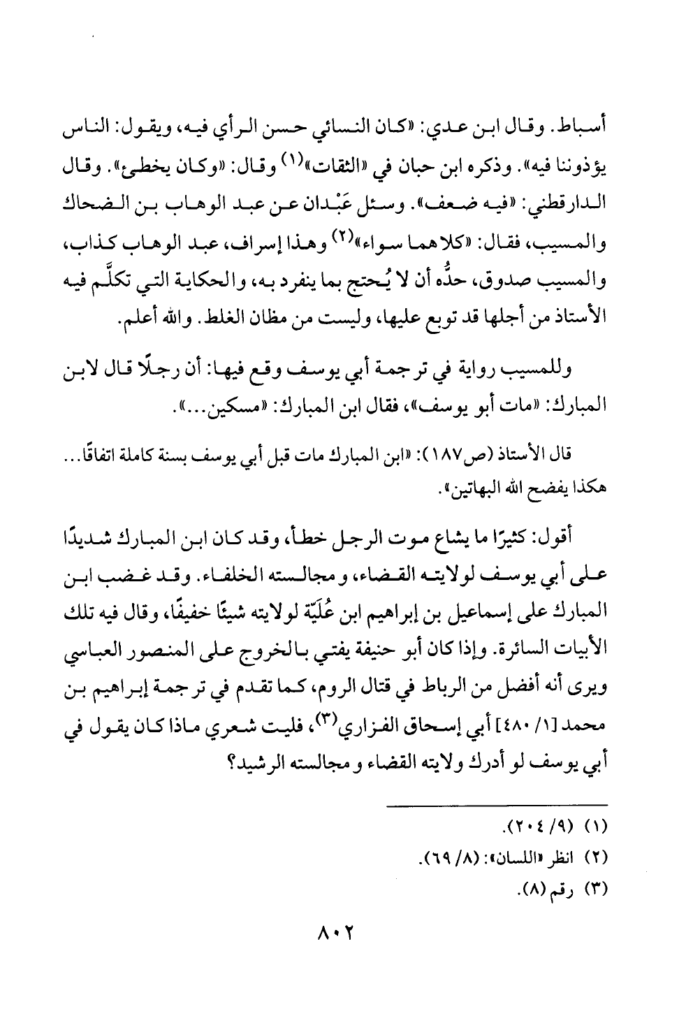 قال الأستاذ (ص ١٨٧): «ابن المبارك مات قبل أبي يوسف بسنة كاملة اتفاقًا ... هكذا يفضح الله البهاتين».