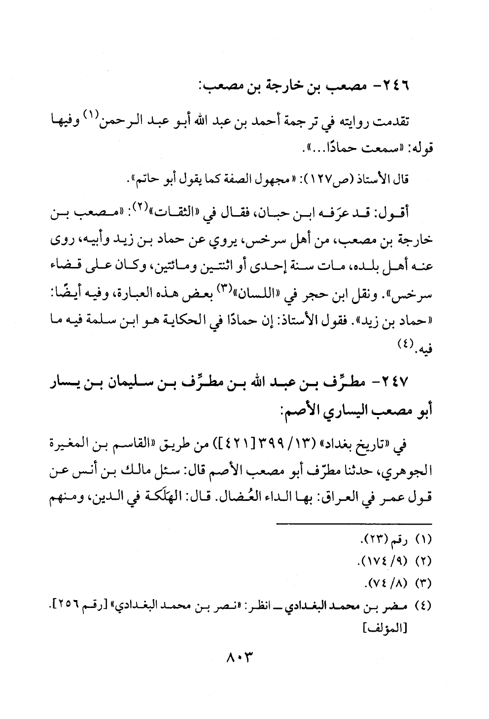 أقول: قد عرَفه ابن حبان، فقال في «الثقات» (¬٢): «مصعب بن خارجة بن مصعب، من أهل سرخس، يروي عن حماد بن زيد وأبيه، روى عنه أهل بلده، مات سنة إحدى أو اثنتين ومائتين، وكان على قضاء سرخس». ونقل ابن حجر في «اللسان» (¬٣) بعض هذه العبارة، وفيه أيضًا: «حماد بن زيد». فقول الأستاذ: إن حمادًا في الحكاية هو ابن سلمة فيه ما فيه. (¬٤)