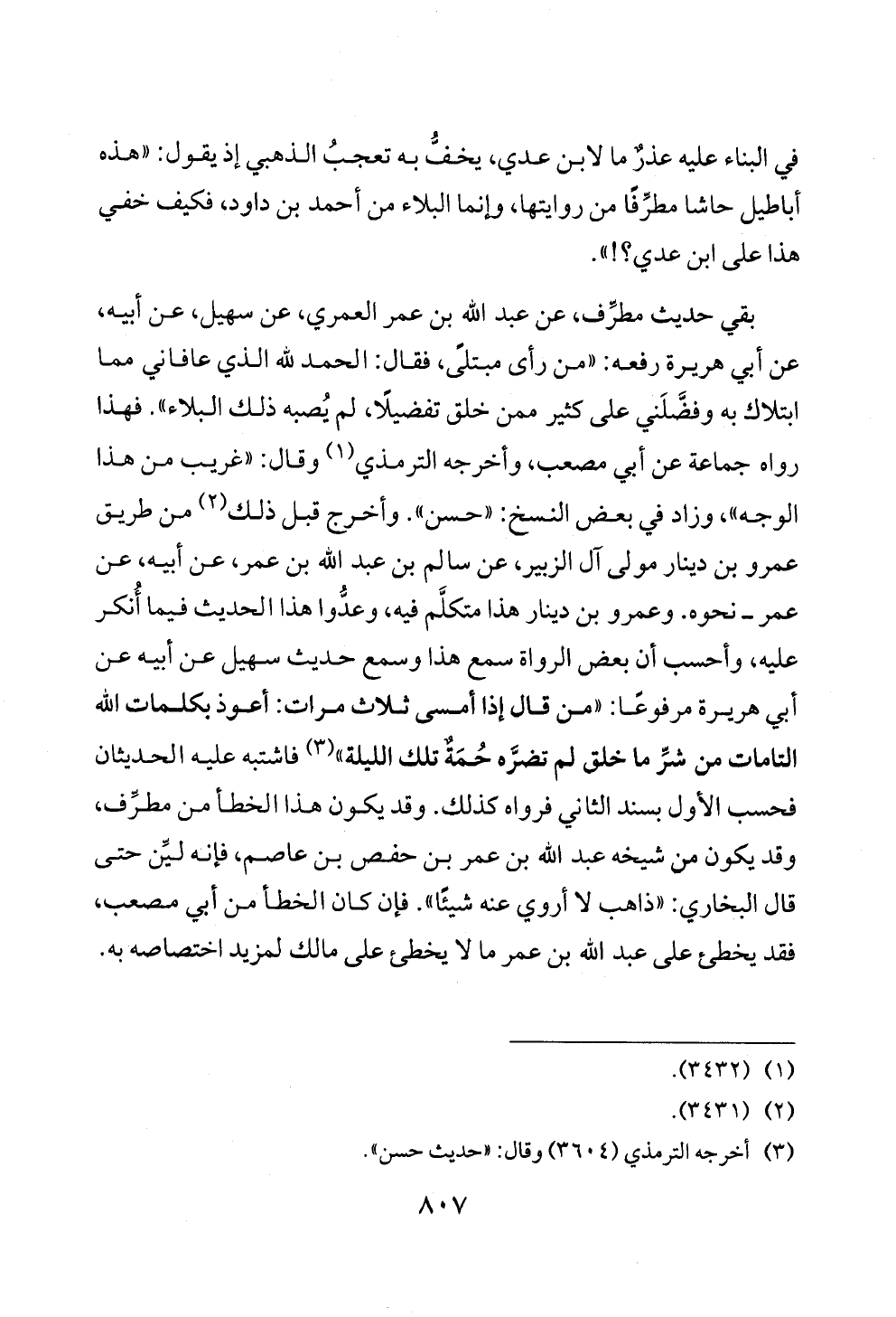 بقي حديث مطرِّف، عن عبد الله بن عمر العمري، عن سهيل، عن أبيه، عن أبي هريرة رفعه: «من رأى مبتلًى، فقال: الحمد لله الذي عافاني مما ابتلاك به وفضَّلَني على كثير ممن خلق تفضيلًا، لم يُصبه ذلك البلاء». فهذا رواه جماعة عن أبي مصعب، وأخرجه الترمذي (¬١) وقال: «غريب من هذا الوجه»، وزاد في بعض النسخ: «حسن». وأخرج قبل ذلك (¬٢) من طريق عمرو بن دينار مولى آل الزبير، عن سالم بن عبد الله بن عمر، عن أبيه، عن عمر ــ نحوه. وعمرو بن دينار هذا متكلَّم فيه، وعدُّوا هذا الحديث فيما أُنكر عليه، وأحسب أن بعض الرواة سمع هذا وسمع حديث سهيل عن أبيه عن أبي هريرة مرفوعًا: «من قال إذا أمسى ثلاث مرات: أعوذ بكلمات الله التامات من شرِّ ما خلق لم تضرَّه حُمَةٌ تلك الليلة» (¬٣) فاشتبه عليه الحديثان فحسب الأول بسند الثاني فرواه كذلك. وقد يكون هذا الخطأ من مطرِّف, وقد يكون من شيخه عبد الله بن عمر بن حفص بن عاصم, فإنه ليِّن حتى قال البخاري: «ذاهب لا أروي عنه شيئًا». فإن كان الخطأ من أبي مصعب, فقد يخطئ على عبد الله بن عمر ما لا يخطئ على مالك لمزيد اختصاصه به.