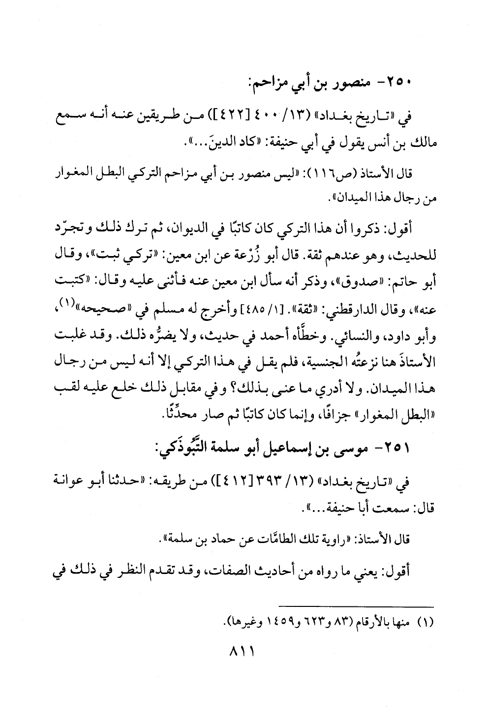 أقول: ذكروا أن هذا التركي كان كاتبًا في الديوان، ثم ترك ذلك وتجرّد للحديث، وهو عندهم ثقة. قال أبو زُرْعة عن ابن معين: «تركي ثبت»، وقال أبو حاتم: «صدوق»، وذكر أنه سأل ابن معين عنه فأثنى عليه وقال: «كتبت عنه»، وقال الدارقطني: «ثقة». [١/ ٤٨٥] وأخرج له مسلم في «صحيحه» (¬١)، وأبو داود، والنسائي. وخطَّأه أحمد في حديث، ولا يضرُّه ذلك. وقد غلبت الأستاذَ هنا نزعتُه الجنسية، فلم يقل في هذا التركي إلا أنه ليس من رجال هذا الميدان. ولا أدري ما عنى بذلك؟ وفي مقابل ذلك خلع عليه لقب «البطل المغوار» جزافًا، وإنما كان كاتبًا ثم صار محدِّثًا.