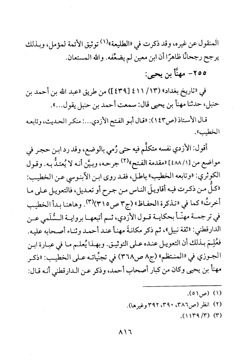 أقول: الأزدي نفسه متكلَّم فيه حتى رُمي بالوضع، وقد رد ابن حجر في مواضع من [١/ ٤٨٨] «مقدمة الفتح» (¬٢) جرحه، وبيَّن أنه لا يُعتدُّ به. وقول الكوثري: «وتابعه الخطيب» باطل، فقد روى ابن الآبنوسي عن الخطيب: «كلُّ من ذكرت فيه أقاويلَ الناس من جرح أو تعديل، فالتعويل على ما أخرتُ» كما في «تذكرة الحفاظ» (ج ٣ ص ٣١٥) (¬٣). وهاهنا بدأ الخطيب في ترجمة مهنّأ بحكاية قول الأزدي، ثم أتبعها برواية السُّلَمي عن الدارقطني: «ثقة نبيل»، ثم ذكر مكانةَ مهنأ عند أحمد وثناء أصحابه عليه. فعُلِمَ بذلك أن التعويل عنده على التوثيق. وبهذا يُعلم ما في عبارة ابن الجوزي في «المنتظم» (ج ٨ ص ٣٦٨) في تجنِّياته على الخطيب: «ذكر مهنأ بن يحيى وكان من كبار أصحاب أحمد، وذكر عن الدارقطني أنه قال: