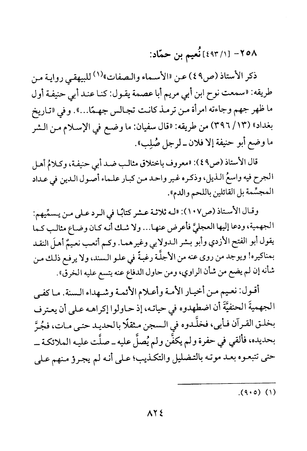 أقول: نعيم من أخيار الأمة وأعلام الأئمة وشهداء السنة. ما كفى الجهميةَ الحنفيَّةَ أن اضطهدوه في حياته، إذ حاولوا إكراهه على أن يعترف بخلق القرآن فأبى، فخلَّدوه في السجن مثقلًا بالحديد حتى مات، فجُرَّ بحديده، فألقي في حفرة ولم يكفَّن ولم يُصلَّ عليه ــ صلَّت عليه الملائكة ــ حتى تتبعوه بعد موته بالتضليل والتكذيب؛ على أنه لم يجرؤ منهم على