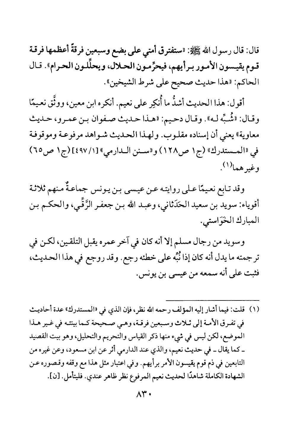 (¬١) قلت: فيما أشار إليه المؤلف رحمه الله نظر، فإن الذي في «المستدرك» عدة أحاديث في تفرق الأمة إلى ثلاث وسبعين فرقة، وهي صحيحة كما بينته في غير هذا الموضع، لكن ليس في شيء منها ذكر القياس والتحريم والتحليل، وهو بيت القصيد ــ كما يقال ــ في حديث نعيم، والذي عند الدارمي أثر عن ابن مسعود، وعن غيره من التابعين في ذم قوم يقيسون الأمر برأيهم. وفي اعتبار مثل هذا مع وقفه وقصوره عن الشهادة الكاملة شاهدًا لحديث نعيم المرفوع نظر ظاهر عندي. فليتأمل. [ن].