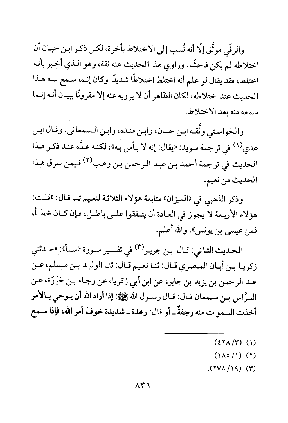 الحديث الثاني: قال ابن جرير (¬٣) في تفسير سورة «سبأ»: «حدثني زكريا بن أبان المصري قال: ثنا نعيم قال: ثنا الوليد بن مسلم، عن عبد الرحمن بن يزيد بن جابر، عن ابن أبي زكريا، عن رجاء بن حَيْوَة، عن النوَّاس بن سمعان قال: قال رسول الله - صلى الله عليه وسلم -: إذا أراد الله أن يوحي بالأمر أخذت السموات منه رجفةٌ ــ أو قال: رعدة ــ شديدة خوفَ أمر الله، فإذا سمع