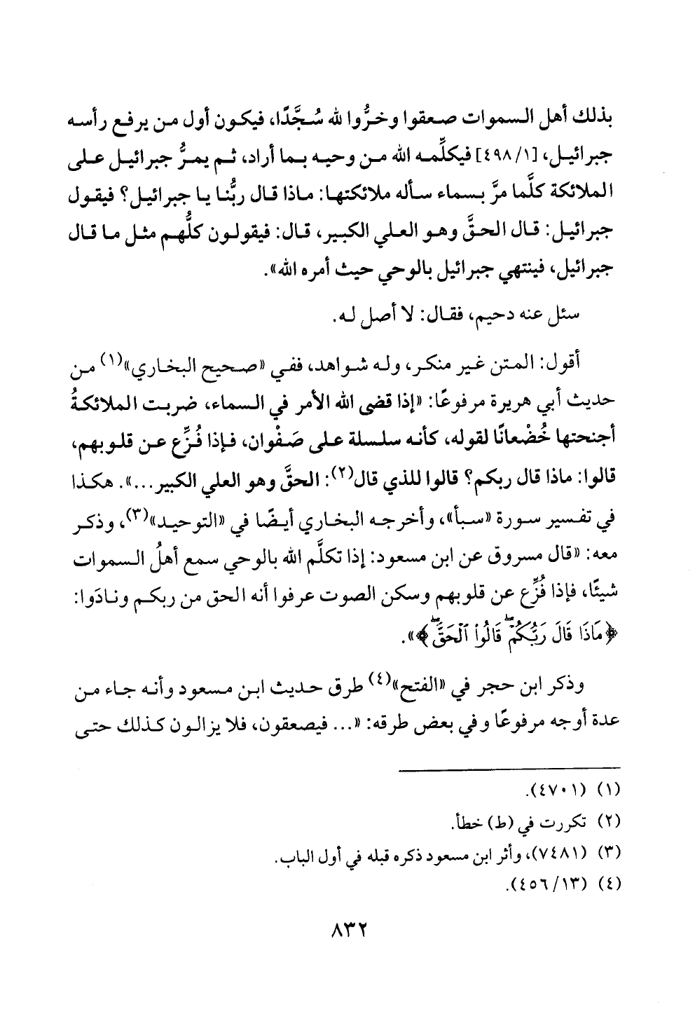بذلك أهل السموات صعقوا وخرُّوا لله سُجَّدًا، فيكون أول من يرفع رأسه جبرائيل، [١/ ٤٩٨] فيكلِّمه الله من وحيه بما أراد، ثم يمرُّ جبرائيل على الملائكة كلَّما مرَّ بسماء سأله ملائكتها: ماذا قال ربُّنا يا جبرائيل؟ فيقول جبرائيل: قال الحقَّ وهو العلي الكبير، قال: فيقولون كلُّهم مثل ما قال جبرائيل، فينتهي جبرائيل بالوحي حيث أمره الله».
