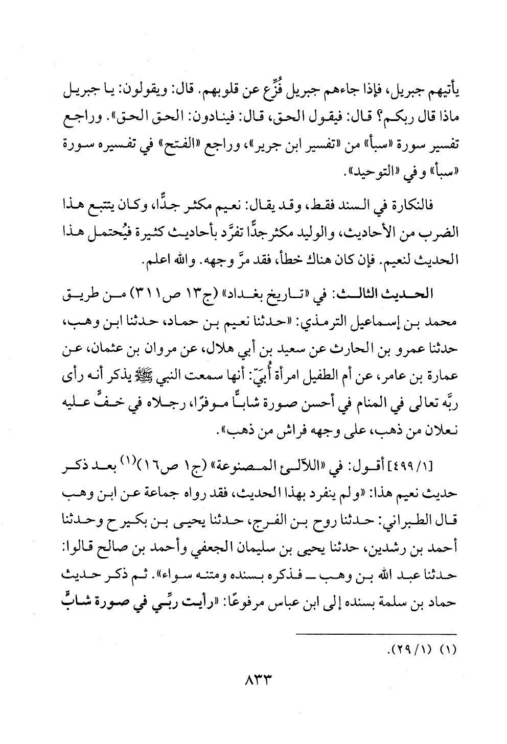 الحديث الثالث: في «تاريخ بغداد» (ج ١٣ ص ٣١١) من طريق محمد بن إسماعيل الترمذي: «حدثنا نعيم بن حماد، حدثنا ابن وهب، حدثنا عمرو بن الحارث عن سعيد بن أبي هلال، عن مروان بن عثمان، عن عمارة بن عامر، عن أم الطفيل امرأة أُبَيّ: أنها سمعت النبي - صلى الله عليه وسلم - يذكر أنه رأى ربَّه تعالى في المنام في أحسن صورة شابًّا موفرًا، رجلاه في خفٍّ عليه نعلان من ذهب، على وجهه فراش من ذهب».