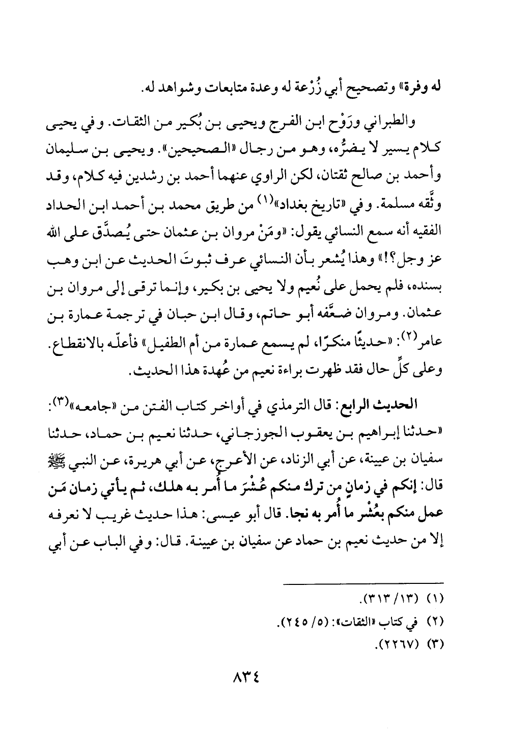 الحديث الرابع: قال الترمذي في أواخر كتاب الفتن من «جامعه» (¬٣): «حدثنا إبراهيم بن يعقوب الجوزجاني، حدثنا نعيم بن حماد، حدثنا سفيان بن عيينة، عن أبي الزناد، عن الأعرج، عن أبي هريرة، عن النبي - صلى الله عليه وسلم - قال: إنكم في زمانٍ من ترك منكم عُشْرَ ما أُمر به هلك، ثم يأتي زمان مَن عمل منكم بعُشْر ما أُمر به نجا. قال أبو عيسى: هذا حديث غريب لا نعرفه إلا من حديث نعيم بن حماد عن سفيان بن عيينة. قال: وفي الباب عن أبي