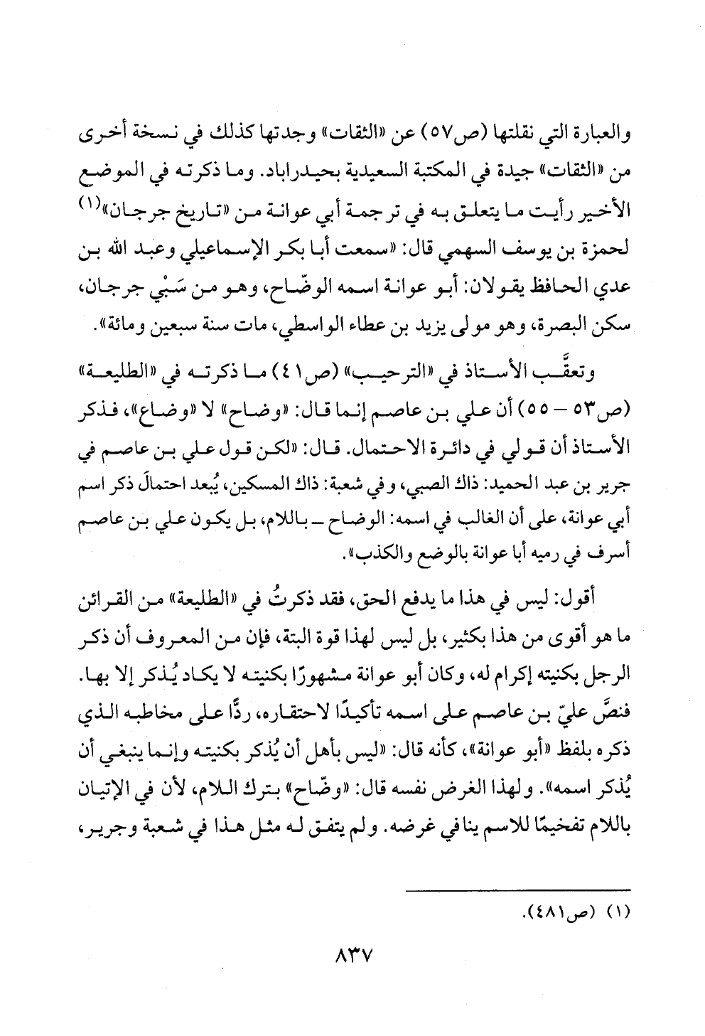 أقول: ليس في هذا ما يدفع الحق، فقد ذكرتُ في «الطليعة» من القرائن ما هو أقوى من هذا بكثير، بل ليس لهذا قوة البتة، فإن من المعروف أن ذكر الرجل بكنيته إكرام له، وكان أبو عوانة مشهورًا بكنيته لا يكاد يُذكر إلا بها. فنصَّ عليّ بن عاصم على اسمه تأكيدًا لاحتقاره، ردًّا على مخاطبه الذي ذكره بلفظ «أبو عوانة»، كأنه قال: «ليس بأهل أن يُذكر بكنيته وإنما ينبغي أن يُذكر اسمه». ولهذا الغرض نفسه قال: «وضّاح» بترك اللام، لأن في الإتيان باللام تفخيمًا للاسم ينافي غرضه. ولم يتفق له مثل هذا في شعبة وجرير،