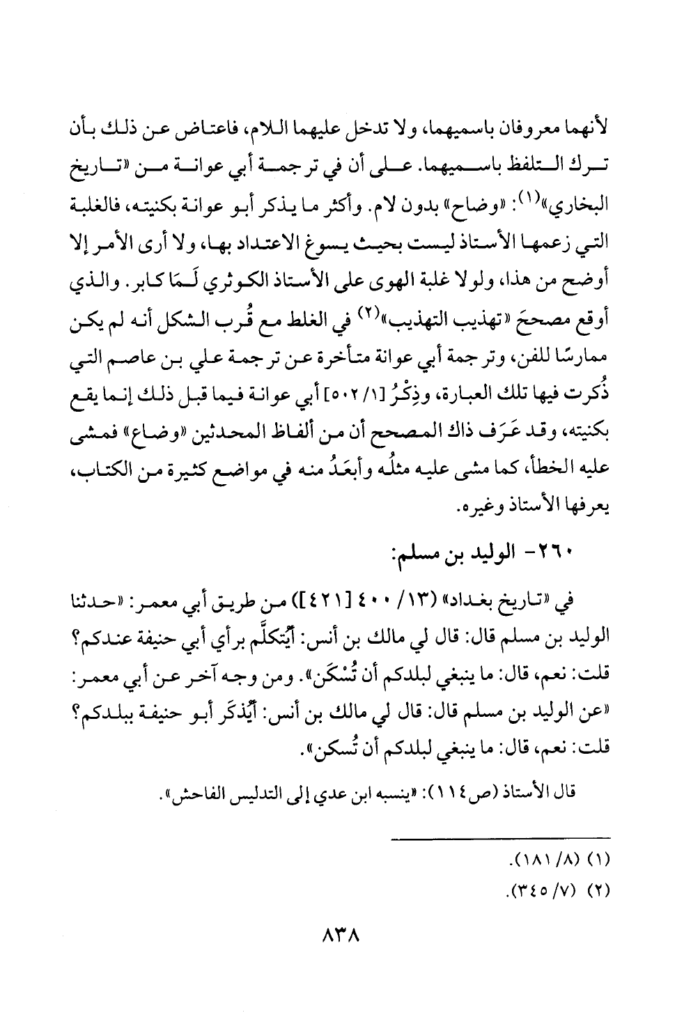 لأنهما معروفان باسميهما، ولا تدخل عليهما اللام، فاعتاض عن ذلك بأن ترك التلفظ باسميهما. على أن في ترجمة أبي عوانة من «تاريخ البخاري» (¬١): «وضاح» بدون لام. وأكثر ما يذكر أبو عوانة بكنيته، فالغلبة التي زعمها الأستاذ ليست بحيث يسوغ الاعتداد بها، ولا أرى الأمر إلا أوضح من هذا، ولولا غلبة الهوى على الأستاذ الكوثري لَمَا كابر. والذي أوقع مصححَ «تهذيب التهذيب» (¬٢) في الغلط مع قُرب الشكل أنه لم يكن ممارسًا للفن، وترجمة أبي عوانة متأخرة عن ترجمة علي بن عاصم التي ذُكرت فيها تلك العبارة، وذِكْرُ [١/ ٥٠٢] أبي عوانة فيما قبل ذلك إنما يقع بكنيته، وقد عَرَف ذاك المصحح أن من ألفاظ المحدثين «وضاع» فمشى عليه الخطأ، كما مشى عليه مثلُه وأبعَدُ منه في مواضع كثيرة من الكتاب، يعرفها الأستاذ وغيره.