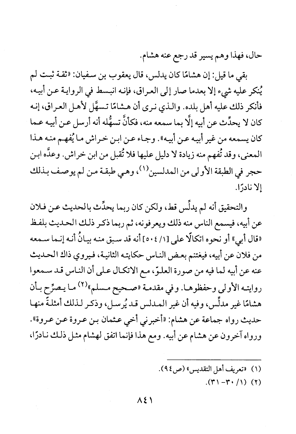 والتحقيق أنه لم يدلِّس قط، ولكن كان ربما يحدِّث بالحديث عن فلان عن أبيه، فيسمع الناس منه ذلك ويعرفونه، ثم ربما ذكر ذلك الحديث بلفظ «قال أبي» أو نحوه اتكالًا على [١/ ٥٠٤] أنه قد سبق منه بيانُ أنه إنما سمعه من فلان عن أبيه، فيغتنم بعض الناس حكايته الثانية، فيروي ذاك الحديث عنه عن أبيه لما فيه من صورة العلوّ، مع الاتكال على أن الناس قد سمعوا روايته الأولى وحفظوها. وفي مقدمة «صحيح مسلم» (¬٢) ما يصرِّح بأن هشامًا غير مدلِّس، وفيه أن غير المدلس قد يُرسل، وذكر لذلك أمثلةً منها حديث رواه جماعة عن هشام: «أخبرني أخي عثمان بن عروة عن عروة». ورواه آخرون عن هشام عن أبيه. ومع هذا فإنما اتفق لهشام مثل ذلك نادرًا،