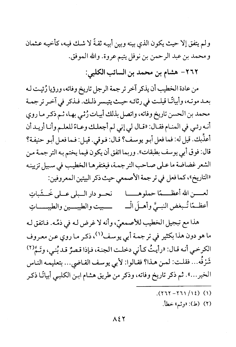 هذا مع تبجيل الخطيب للأصمعيّ، وأنه لا غرض له في ذمِّه. فاتفق له ما هو دون هذا بكثير في ترجمة أبي يوسف (¬١)، ذكر ما روي عن معروف الكرخي أنه قال: «رأيتُ كأني دخلت الجنة, فإذا قصرٌ قد بُني, وتَمَّ (¬٢) شَرْفُه ... فقلت: لمن هذا؟ فقالوا: لأبي يوسف القاضي ... بتعليمه الناس الخير ... ». ثم ذكر تاريخ وفاته, وذكر من طريق هشام ابن الكلبي أبياتًا ذكر