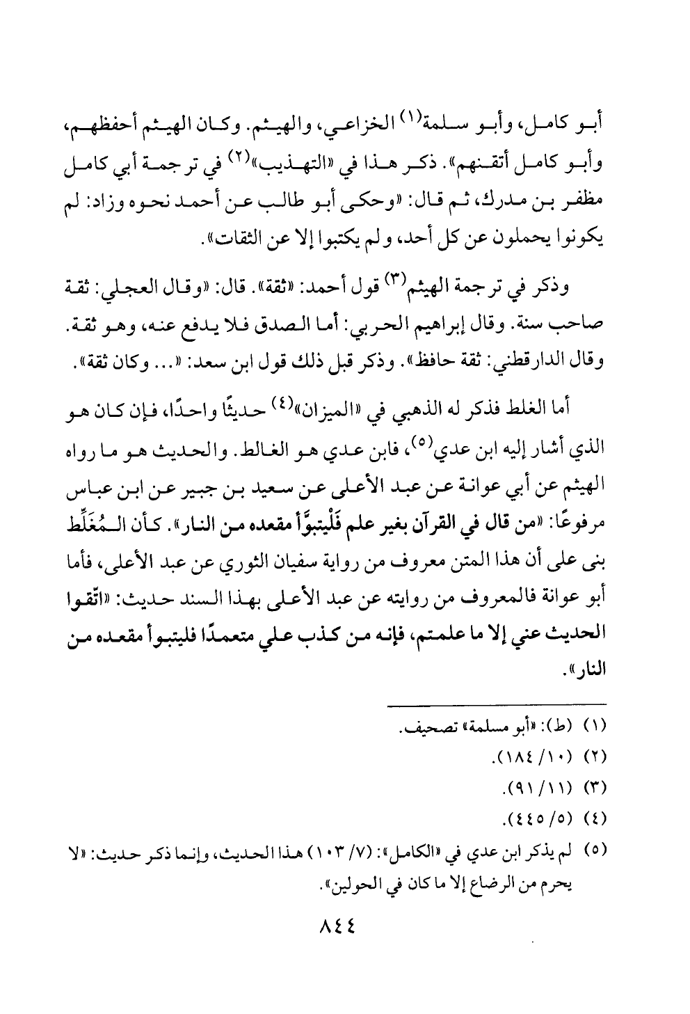 أما الغلط فذكر له الذهبي في «الميزان» (¬٤) حديثًا واحدًا، فإن كان هو الذي أشار إليه ابن عدي (¬٥)، فابن عدي هو الغالط. والحديث هو ما رواه الهيثم عن أبي عوانة عن عبد الأعلى عن سعيد بن جبير عن ابن عباس مرفوعًا: «من قال في القرآن بغير علم فَلْيتبوَّأ مقعده من النار». كأن المُغَلِّط بنى على أن هذا المتن معروف من رواية سفيان الثوري عن عبد الأعلى، فأما أبو عوانة فالمعروف من روايته عن عبد الأعلى بهذا السند حديث: «اتّقوا الحديث عني إلا ما علمتم، فإنه من كذب علي متعمدًا فليتبوأ مقعده من النار».