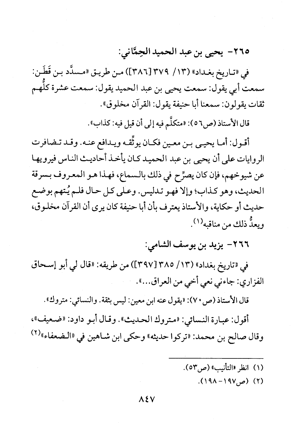 أقول: أما يحيى بن معين فكان يوثِّقه ويدافع عنه. وقد تضافرت الروايات على أن يحيى بن عبد الحميد كان يأخذ أحاديث الناس فيرويها عن شيوخهم، فإن كان يصرِّح في ذلك بالسماع، فهذا هو المعروف بسرقة الحديث، وهو كذاب؛ وإلا فهو تدليس. وعلى كل حال فلم يُتهم بوضع حديث أو حكاية، والأستاذ يعترف بأن أبا حنيفة كان يرى أن القرآن مخلوق، ويعدُّ ذلك من مناقبه (¬١).