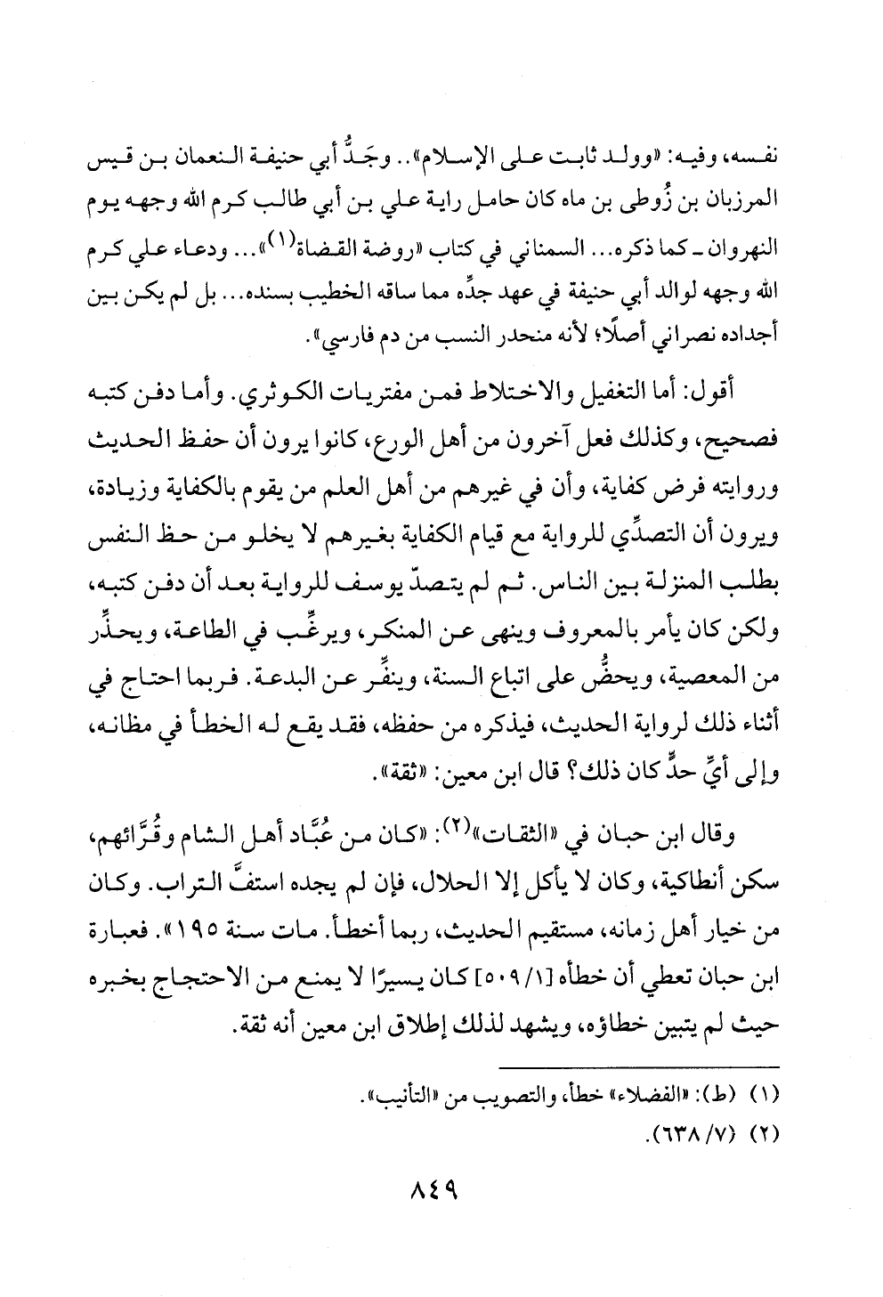 نفسه، وفيه: «وولد ثابت على الإسلام» .. وجَدُّ أبي حنيفة النعمان بن قيس المرزبان بن زُوطى بن ماه كان حامل راية علي بن أبي طالب كرم الله وجهه يوم النهروان ــ كما ذكره ... السمناني في كتاب «روضة القضاة (¬١)» ... ودعاء علي كرم الله وجهه لوالد أبي حنيفة في عهد جدِّه مما ساقه الخطيب بسنده ... بل لم يكن بين أجداده نصراني أصلًا؛ لأنه منحدر النسب من دم فارسي».