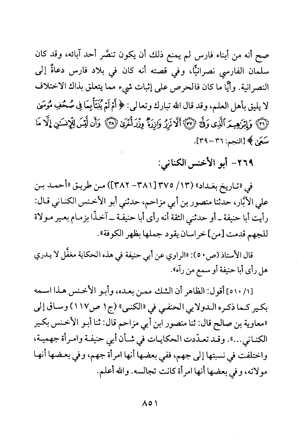 [١/ ٥١٠] أقول: الظاهر أن الشك ممن بعده، وأبو الأخنس هذا اسمه بكير كما ذكره الدولابي الحنفي في «الكنى» (ج ١ ص ١١٧) وساق إلى «معاوية بن صالح قال: ثنا منصور ابن أبي مزاحم قال: ثنا أبو الأخنس بكير الكناني ... ». وقد تعدّدت الحكايات في شأن أبي حنيفة وامرأة جهمية، واختلفت في نسبتها إلى جهم، ففي بعضها أنها امرأة جهم، وفي بعضها أنها مولاته، وفي بعضها أنها امرأة كانت تجالسه. والله أعلم.