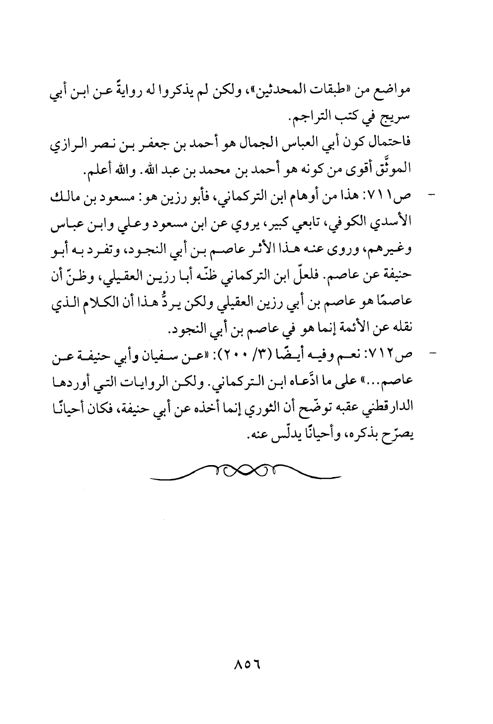 - ص ٧١١: هذا من أوهام ابن التركماني، فأبو رزين هو: مسعود بن مالك الأسدي الكوفي، تابعي كبير، يروي عن ابن مسعود وعلي وابن عباس وغيرهم، وروى عنه هذا الأثر عاصم بن أبي النجود، وتفرد به أبو حنيفة عن عاصم. فلعلّ ابن التركماني ظنّه أبا رزين العقيلي، وظنّ أن عاصمًا هو عاصم بن أبي رزين العقيلي ولكن يردُّ هذا أن الكلام الذي نقله عن الأئمة إنما هو في عاصم بن أبي النجود.