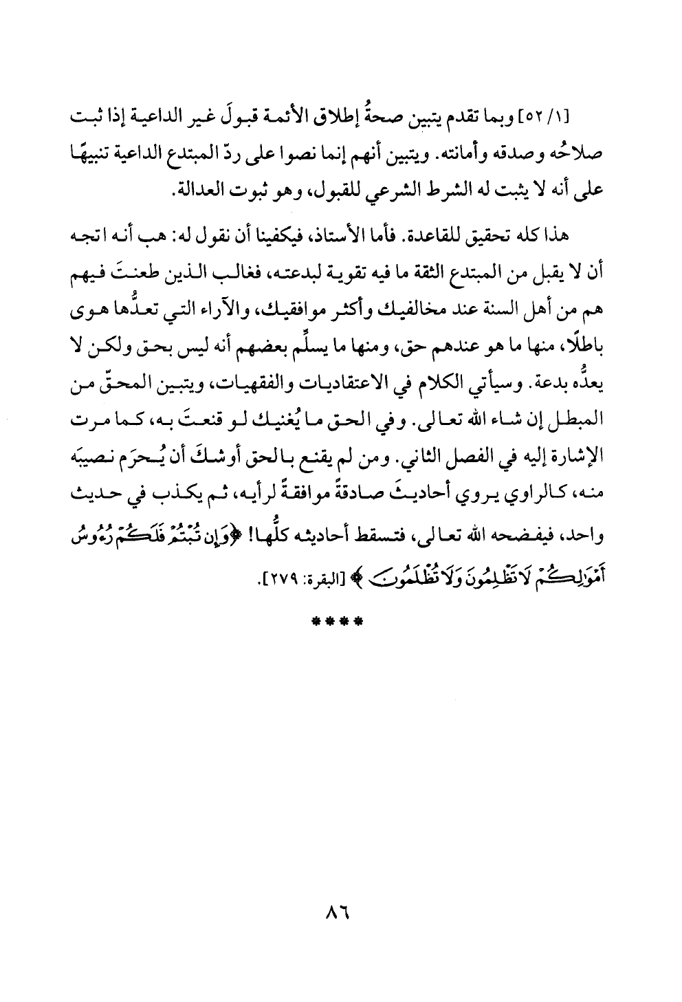 [١/ ٥٢] وبما تقدم يتبين صحةُ إطلاق الأئمة قبولَ غير الداعية إذا ثبت صلاحُه وصدقه وأمانته. ويتبين أنهم إنما نصوا على ردّ المبتدع الداعية تنبيهًا على أنه لا يثبت له الشرط الشرعي للقبول، وهو ثبوت العدالة.
