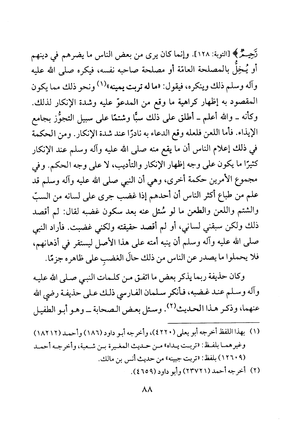 رَحِيمٌ} [التوبة: ١٢٨]. وإنما كان يرى من بعض الناس ما يضرهم في دينهم أو يُخِلُّ بالمصلحة العامّة أو مصلحة صاحبه نفسه، فيكره صلى الله عليه وآله وسلم ذلك وينكره، فيقول: "ما له تربت يمينه" (¬١) ونحو ذلك مما يكون المقصود به إظهار كراهية ما وقع من المدعوّ عليه وشدة الإنكار لذلك. وكأنه ــ والله أعلم ــ أطلق على ذلك سبًّا وشتمًا على سبيل التجوُّز بجامع الإيذاء. فأما اللعن فلعله وقع الدعاء به نادرًا عند شدة الإنكار. ومن الحكمة في ذلك إعلام الناس أن ما يقع منه صلى الله عليه وآله وسلم عند الإنكار كثيرًا ما يكون على وجه إظهار الإنكار والتأديب، لا على وجه الحكم. وفي مجموع الأمرين حكمة أخرى، وهي أن النبي صلى الله عليه وآله وسلم قد علم من طباع أكثر الناس أن أحدهم إذا غضب جرى على لسانه من السبّ والشتم واللعن والطعن ما لو سُئل عنه بعد سكون غضبه لقال: لم أقصد ذلك ولكن سبقني لساني، أو لم أقصد حقيقته ولكني غضبت. فأراد النبي صلى الله عليه وآله وسلم أن ينبه أمته على هذا الأصل ليستقر في أذهانهم، فلا يحملوا ما يصدر عن الناس من ذلك حالَ الغضبِ على ظاهره جزمًا.