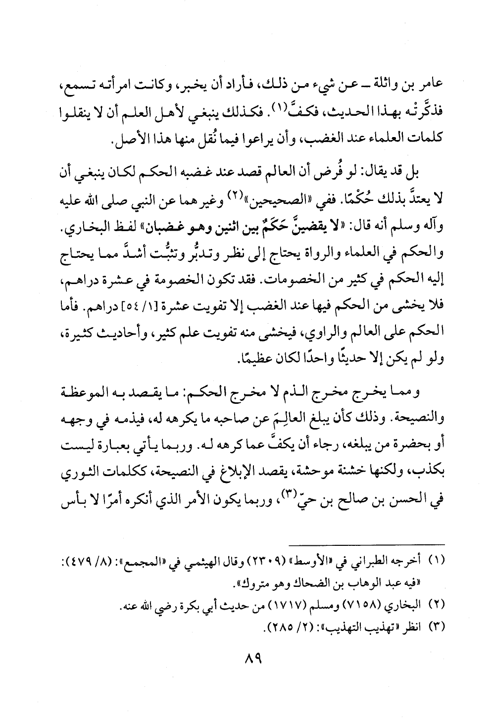 بل قد يقال: لو فُرض أن العالم قصد عند غضبه الحكم لكان ينبغي أن لا يعتدَّ بذلك حُكْمًا. ففي "الصحيحين" (¬٢) وغيرهما عن النبي صلى الله عليه وآله وسلم أنه قال: "لا يقضينَّ حَكَمٌ بين اثنين وهو غضبان" لفظ البخاري. والحكم في العلماء والرواة يحتاج إلى نظر وتدبُّر وتثبُّت أشدَّ مما يحتاج إليه الحكم في كثير من الخصومات. فقد تكون الخصومة في عشرة دراهم، فلا يخشى من الحكم فيها عند الغضب إلا تفويت عشرة [١/ ٥٤] دراهم. فأما الحكم على العالم والراوي، فيخشى منه تفويت علم كثير، وأحاديث كثيرة، ولو لم يكن إلا حديثًا واحدًا لكان عظيمًا.